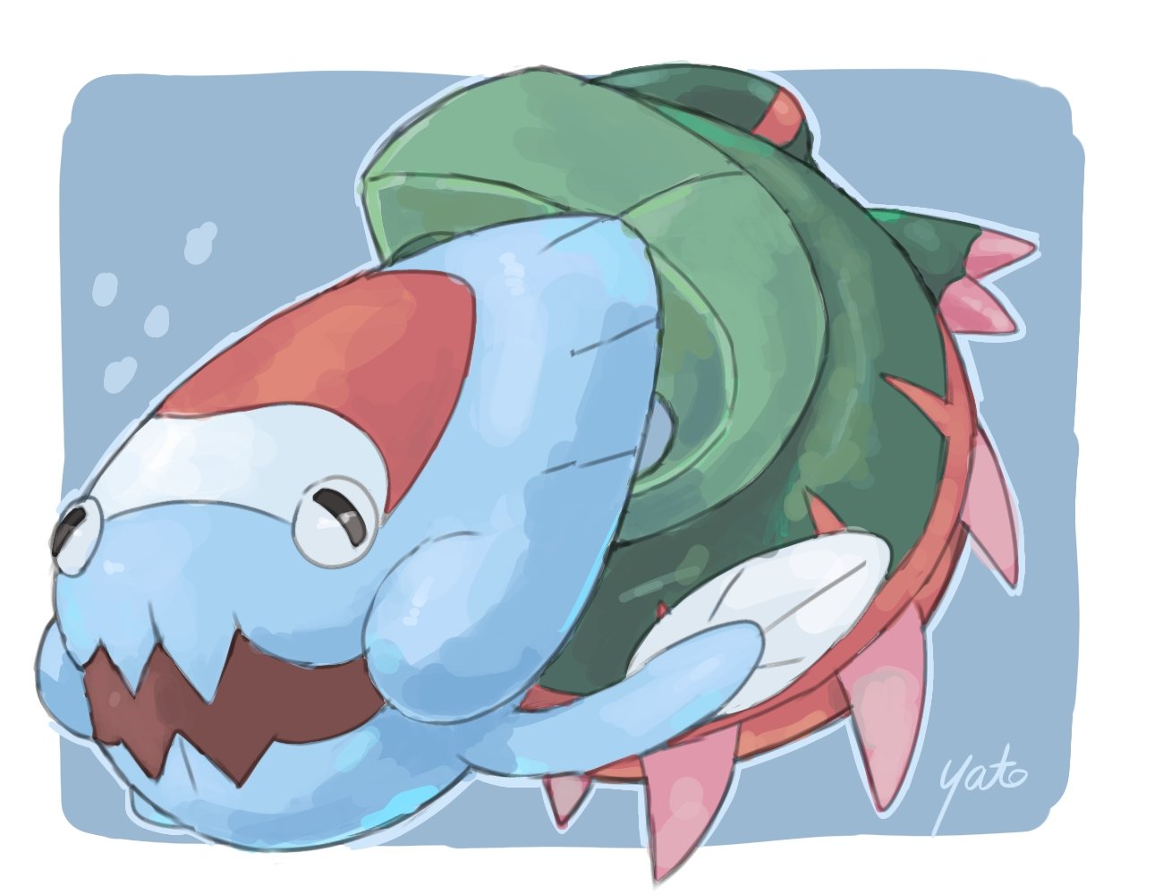black_eyes border claws commentary_request dracovish fang full_body gen_8_pokemon grey_background happi_xfyg nintendo no_humans open_mouth outline pokemon pokemon_(creature) signature skin_fang solo spikes white_border