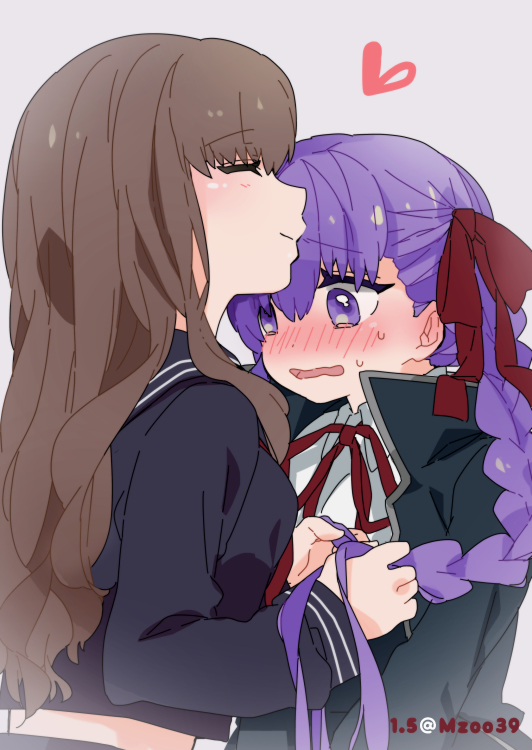 2girls alternate_hairstyle artist_name bb_(fate) bb_(fate/extra) black_coat blush braid breasts brown_hair closed_eyes coat commentary_request fate/extra fate/extra_ccc fate_(series) kishinami_hakuno_(female) long_hair long_sleeves looking_at_another multiple_girls open_mouth osakana_(rrg0123) purple_eyes purple_hair red_ribbon ribbon school_uniform serafuku shirt smile sweat tsukumihara_academy_uniform_(fate/extra_ccc) twitter_username upper_body wavy_hair white_background white_shirt yuri