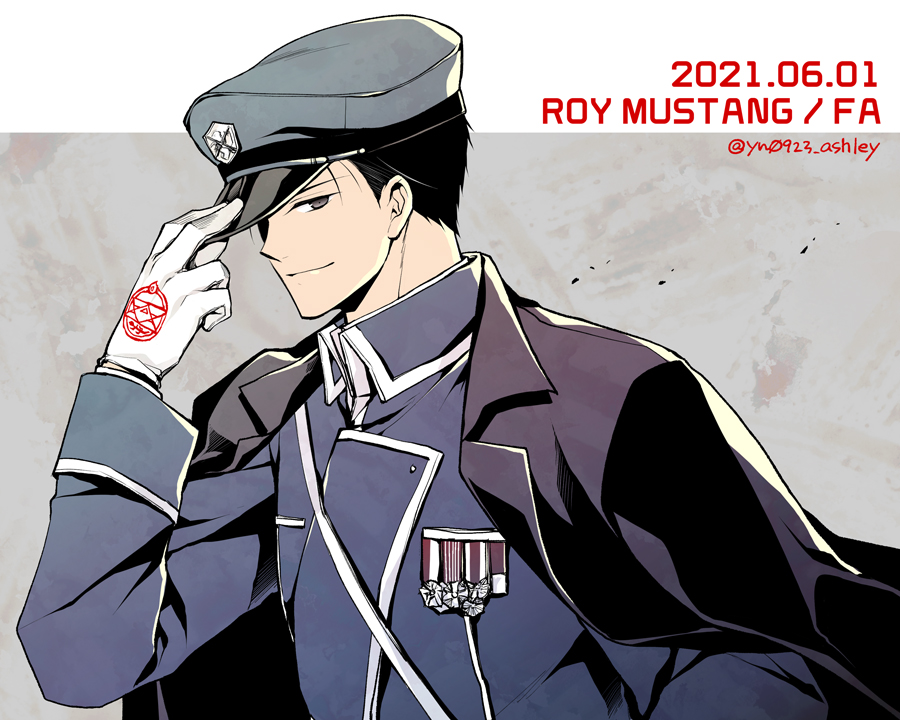 1boy artist_name black_coat black_hair blue_shirt character_name coat dated fullmetal_alchemist gloves grey_eyes hand_on_headwear hat light_smile long_sleeves looking_at_viewer male_focus medal military military_uniform peaked_cap roy_mustang shirt short_hair solo takafuji_yuna twitter_username upper_body white_gloves