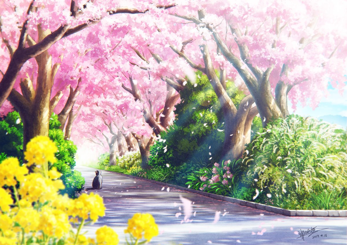 blue_sky bush cat cherry_blossoms cloud cloudy_sky commentary_request dappled_sunlight day fantasy horizon kaminaga_mutsumi no_humans original outdoors road scenery sky sunlight tagme tree vanishing_point