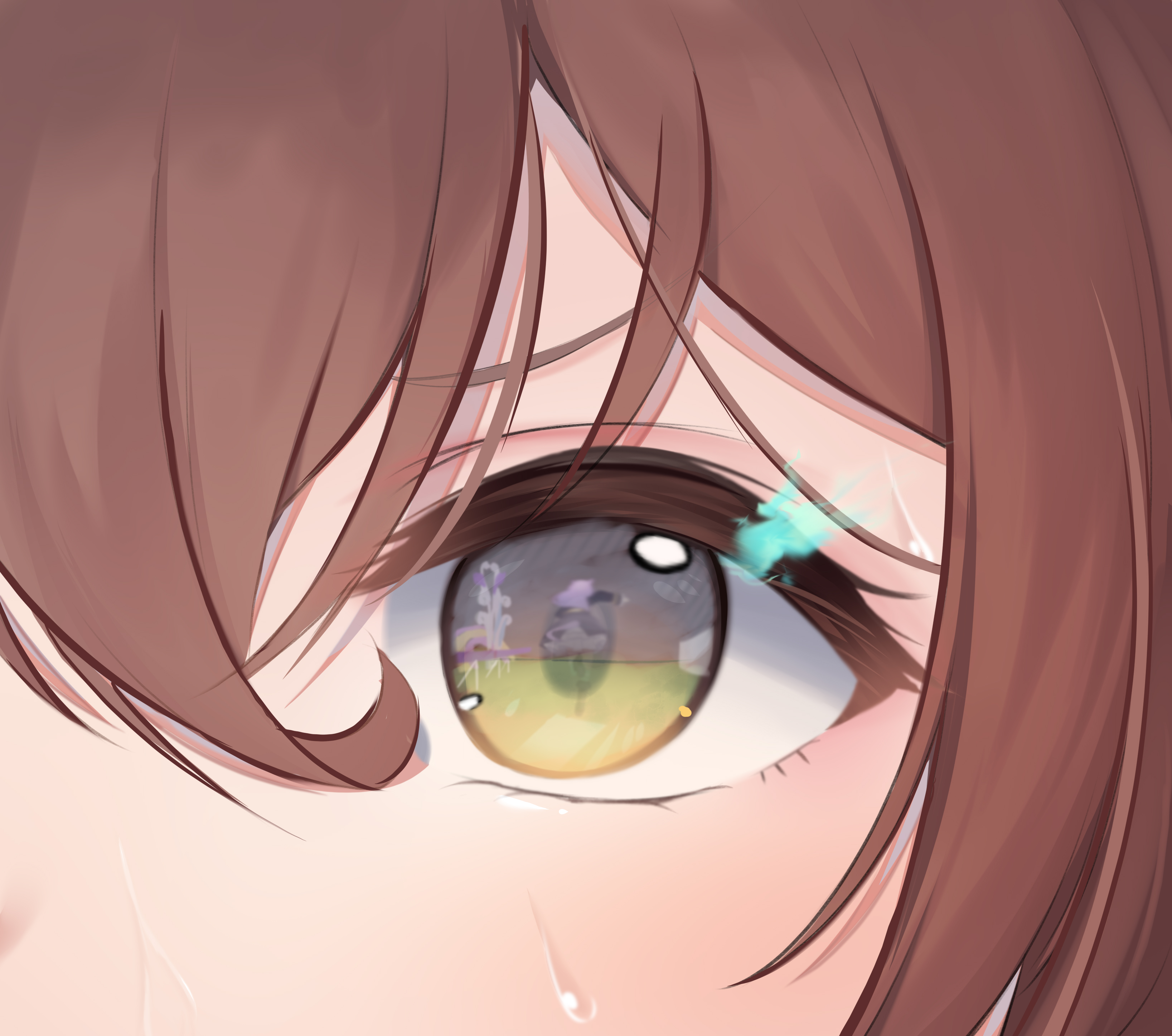1girl absurdres brown_hair close-up commentary_request eye_focus eye_reflection hair_between_eyes highres looking_at_viewer mejiro_bright_(umamusume) reflection roido_(taniko-t-1218) solo sweat umamusume yellow_eyes