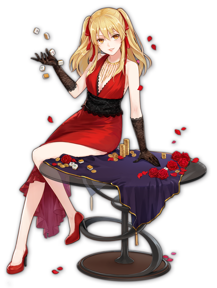 1girl artist_request black_gloves blonde_hair coin dress elbow_gloves flower game_cg glass_table gloves gold_coin high_heels jewelry kakegurui lips looking_at_viewer mahjong mahjong_soul mahjong_tile necklace official_art petals red_dress red_flower red_footwear red_ribbon red_rose ribbon rose saotome_mary simple_background sitting sitting_on_table smile table tablecloth tassel third-party_source transparent_background twintails yostar