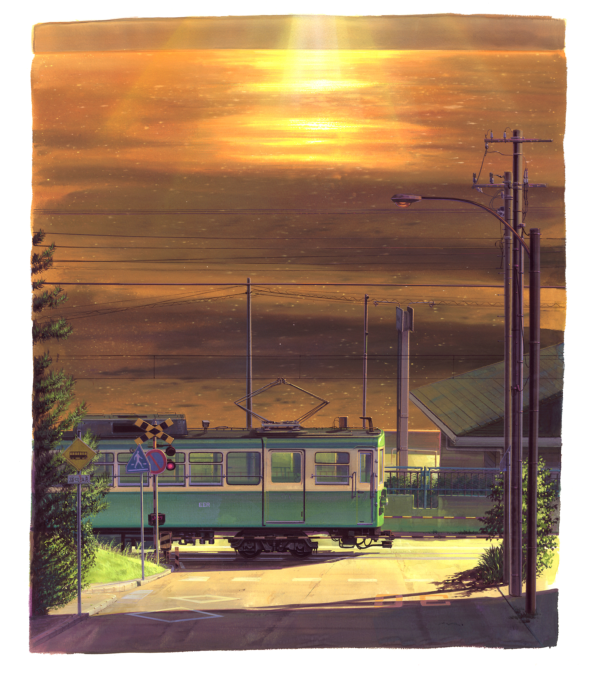 building commentary_request enoshima_electric_railway highres multiple_unit_train no_humans ocean original outdoors painting_(medium) power_lines road road_sign rural scenery shonan211 sign street sunset traditional_media traffic_light train utility_pole vanishing_point water watercolor_(medium)