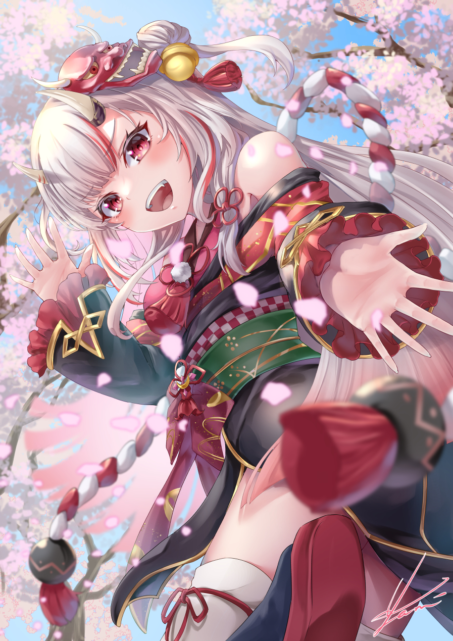 1girl :d bell black_kimono cherry_blossoms cherry_tree double_bun falling_petals fang flower_knot from_below hair_bell hair_bun hair_ornament hand_up head_tilt highres hololive horns japanese_clothes kimono looking_at_viewer mask mask_on_head multicolored_hair nakiri_ayame nakiri_ayame_(1st_costume) obi off_shoulder oni_mask open_mouth petals reaching reaching_towards_viewer red_eyes red_hair red_mask red_shirt sash shirt short_kimono signature silver_hair skin-covered_horns smile solo standing standing_on_one_leg streaked_hair thighhighs virtual_youtuber white_thighhighs yam_(yam6056)
