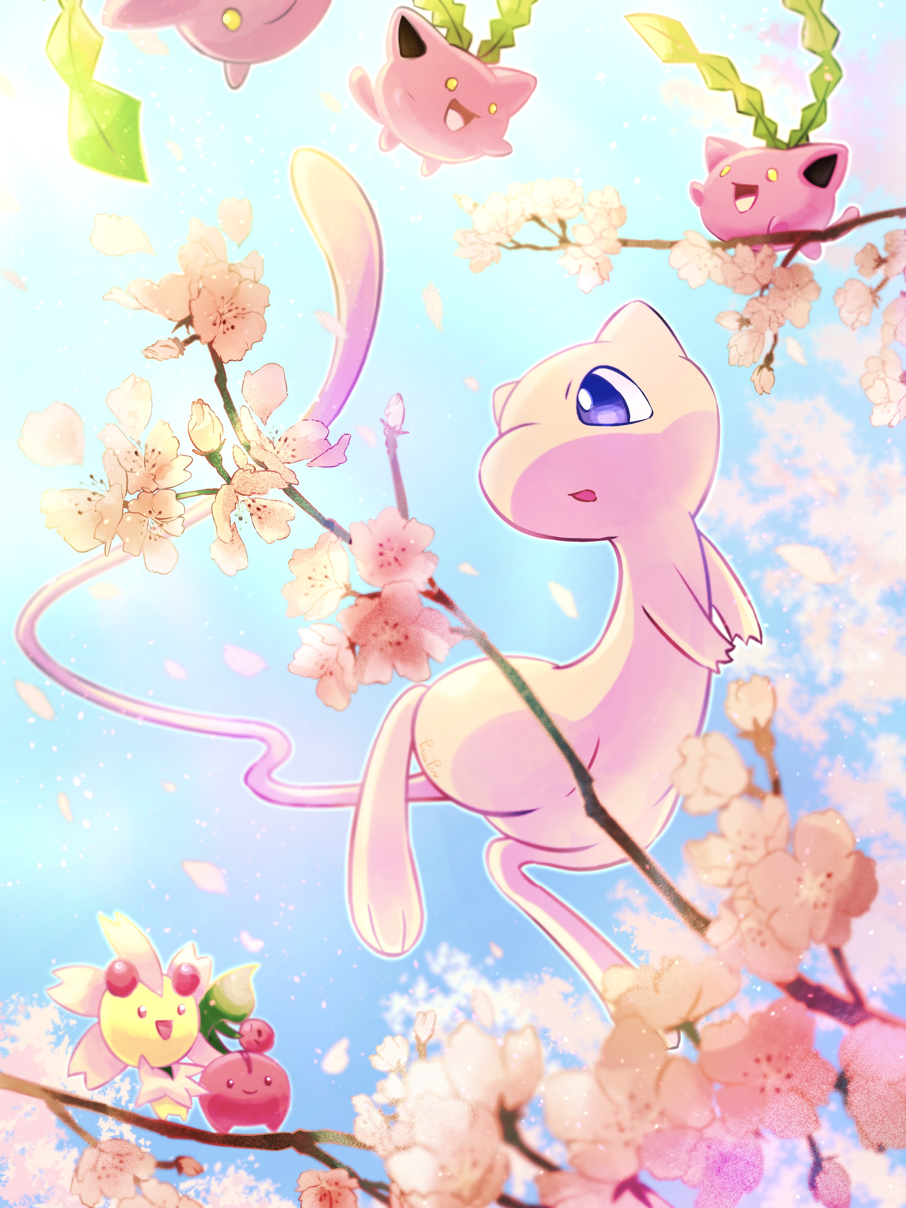 :d absurdres bad_id bad_pixiv_id cherrim cherubi commentary_request day falling_petals flower flying gen_1_pokemon gen_2_pokemon gen_4_pokemon happy highres hoppip legendary_pokemon mew_(pokemon) mythical_pokemon nintendo no_humans open_mouth outdoors petals pokemon pokemon_(creature) ponkotsu_tanupon smile standing tongue yellow_eyes