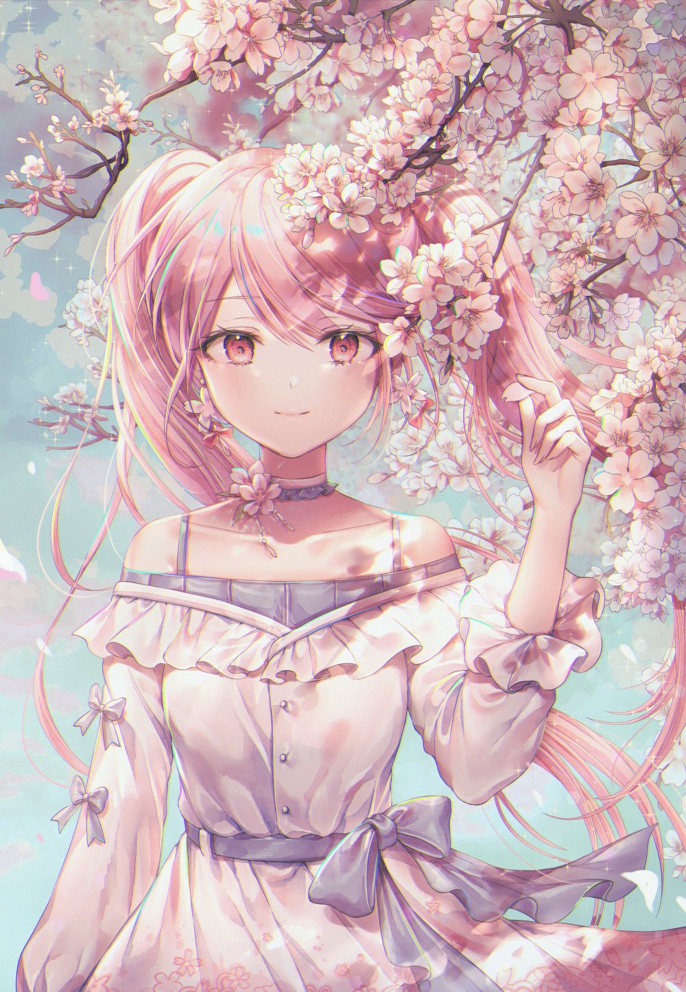 1girl cherry_blossoms dress hair_between_eyes hatsune_miku highres long_hair looking_at_viewer off_shoulder orange_eyes ozzingo pink_hair pink_theme ribbon sakura_miku simple_background smile solo spring_(season) strapless strapless_dress twintails very_long_hair vocaloid white_dress