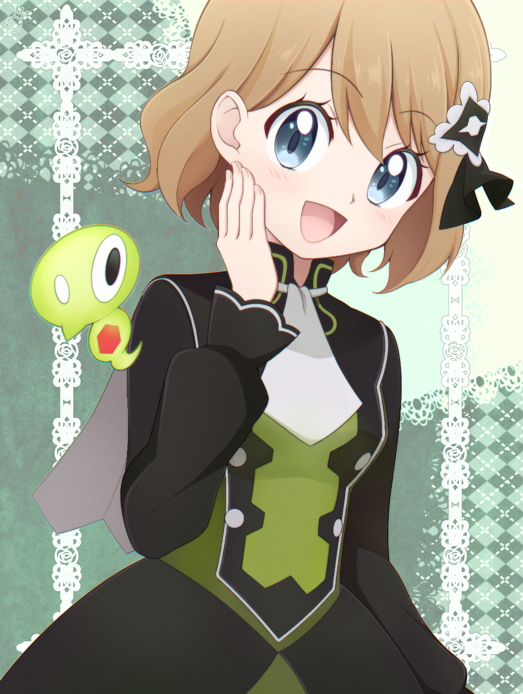 1girl :d ascot black_dress black_ribbon blonde_hair blush buttons capelet commentary_request dress eyelashes gen_6_pokemon green_background grey_eyes hair_ornament hair_ribbon hand_up happy highres kouzuki_(reshika213) legendary_pokemon long_sleeves looking_at_viewer nintendo official_alternate_costume open_mouth pokemon pokemon_(creature) pokemon_masters_ex ribbon serena_(pokemon) serena_(sygna_suit)_(pokemon) short_hair smile tongue white_ascot white_capelet zygarde zygarde_core