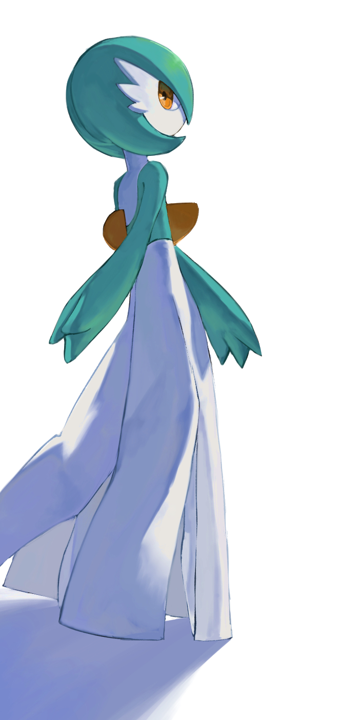 1girl alternate_color aqua_hair aqua_skin bob_cut colored_skin female_focus from_behind full_body gardevoir gen_3_pokemon highres horezai looking_at_viewer looking_back multicolored_skin nintendo no_feet orange_eyes pokemon pokemon_(creature) shiny_pokemon short_hair simple_background solo standing two-tone_skin white_background white_skin
