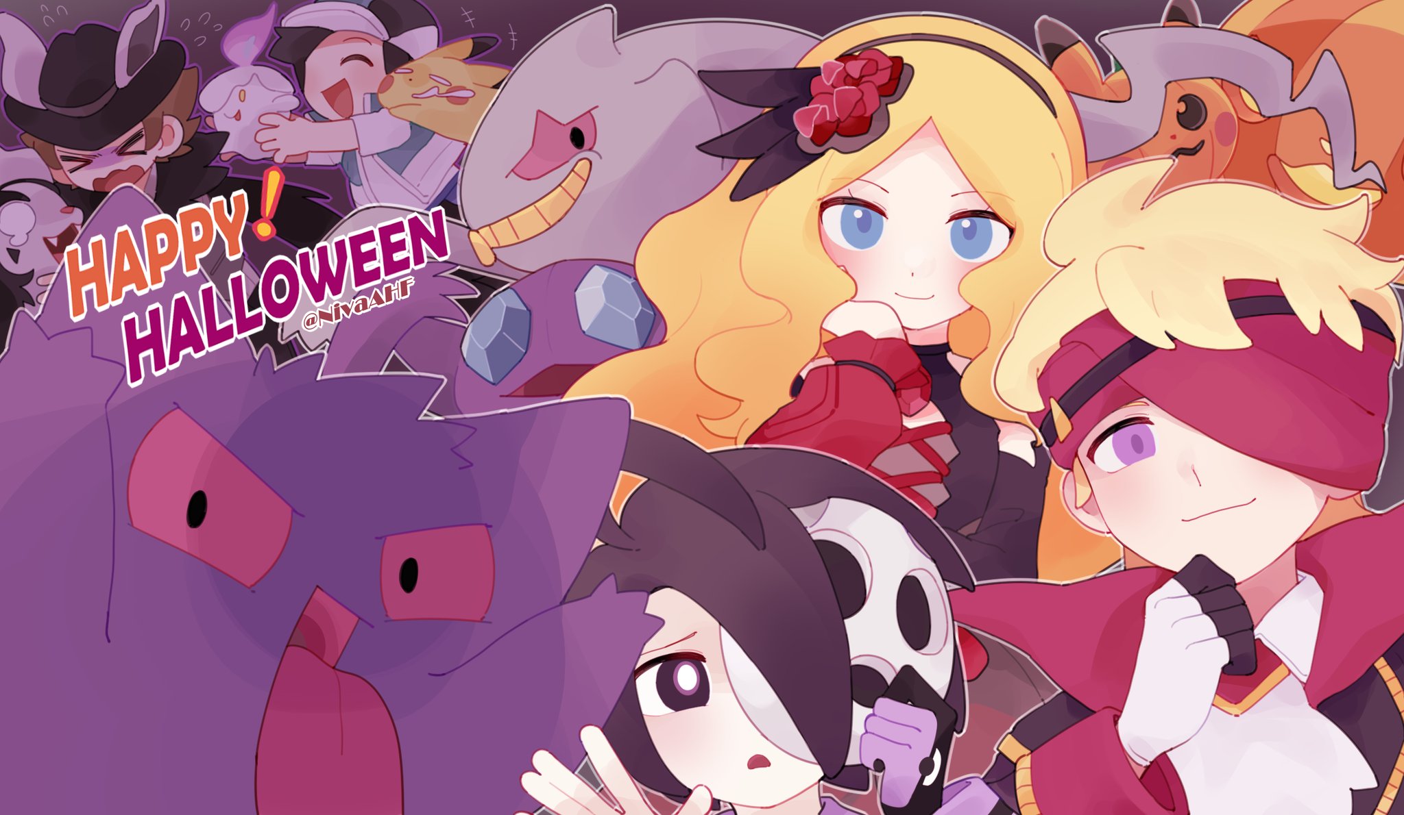 +++ 1girl 4boys :d ahoge allister_(pokemon) banette blonde_hair blush caitlin_(fall_2021)_(pokemon) caitlin_(pokemon) closed_eyes closed_mouth commentary_request flying_sweatdrops gen_1_pokemon gen_3_pokemon gen_5_pokemon gengar gloves hairband halloween hand_up happy_halloween headband highres hilbert_(fall_2020)_(pokemon) hilbert_(pokemon) holding holding_mask holding_pokemon jiugong_chi litwick long_hair mask mightyena morty_(fall_2021)_(pokemon) morty_(pokemon) multiple_boys nintendo official_alternate_costume open_mouth pikachu pokemon pokemon_(creature) pokemon_masters_ex pokemon_sword_and_shield pumpkin purple_eyes sableye scottie_(pokemon) short_hair single_glove smile