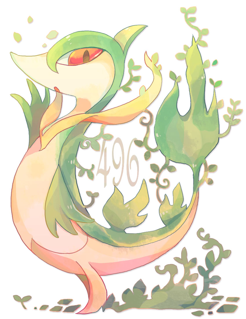 akadako animal_focus from_side full_body gen_5_pokemon grass hand_up looking_at_viewer nintendo no_humans one-hour_drawing_challenge open_mouth plant pokedex_number pokemon pokemon_(creature) profile red_eyes servine simple_background solo standing vines white_background