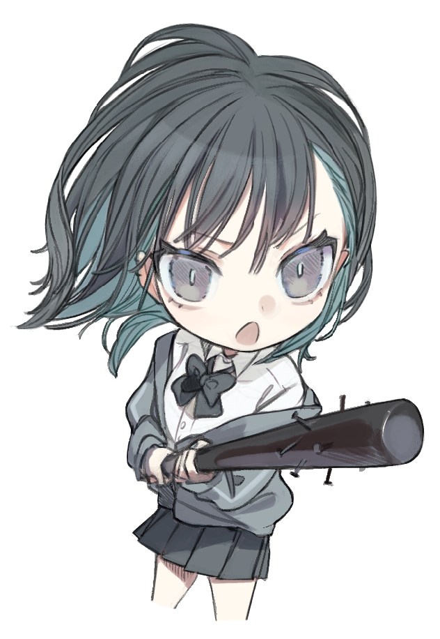 1girl :o baseball_bat black_bow black_bowtie black_eyes black_hair black_jacket black_skirt boukou-chan_(tokiwata_soul) bow bowtie buttons check_commentary chibi collared_shirt colored_inner_hair commentary_request cowboy_shot cropped_legs dress_shirt eyelashes foreshortening green_hair holding holding_baseball_bat jacket legs multicolored_hair nail_(hardware) nail_bat open_mouth original pleated_skirt shirt short_hair simple_background skirt tokiwata_soul v-shaped_eyebrows white_background white_shirt