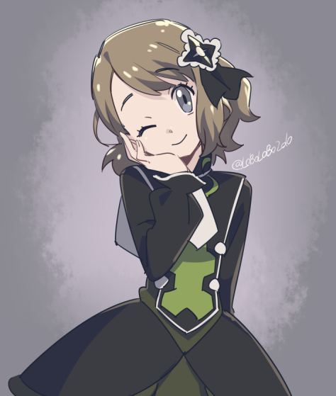 1girl ;) ascot black_dress brown_hair buttons closed_mouth commentary_request dress eyelashes grey_background grey_eyes hand_up head_tilt long_sleeves looking_at_viewer momoji_(lobolobo2010) nintendo official_alternate_costume one_eye_closed pokemon pokemon_masters_ex serena_(pokemon) serena_(sygna_suit)_(pokemon) short_hair smile solo twitter_username white_ascot