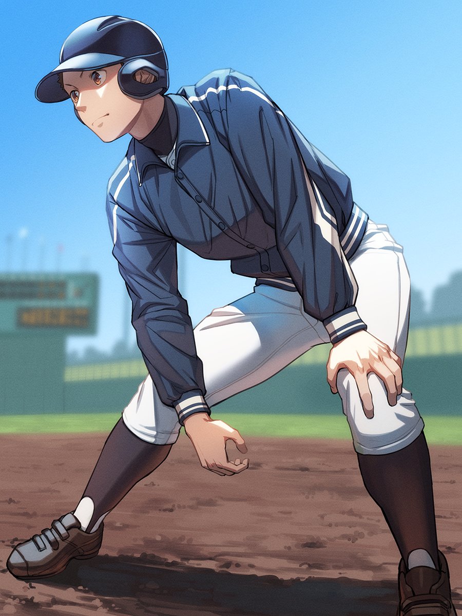 1boy baseball_helmet baseball_stadium baseball_uniform black_footwear blue_jacket blurry blurry_background brown_eyes cleats day helmet highres hunched_over jacket male_focus original outdoors pants sky solo sportswear standing stirrup_legwear tettabuzz toeless_legwear undershirt white_pants