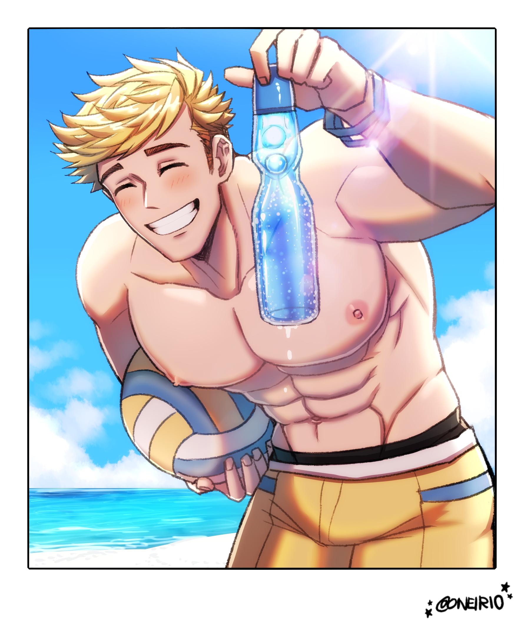1boy abs ball bara beach beachball blonde_hair blush bottle closed_eyes day granblue_fantasy highres holding holding_ball holding_bottle large_pectorals male_focus male_swimwear muscular muscular_male navel nipples oneirio outdoors pectorals short_hair sideburns smile soda_bottle solo summer swim_trunks swimsuit teeth topless_male twitter_username undercut vane_(granblue_fantasy) vane_(summer)_(granblue_fantasy) yellow_male_swimwear yellow_swim_trunks