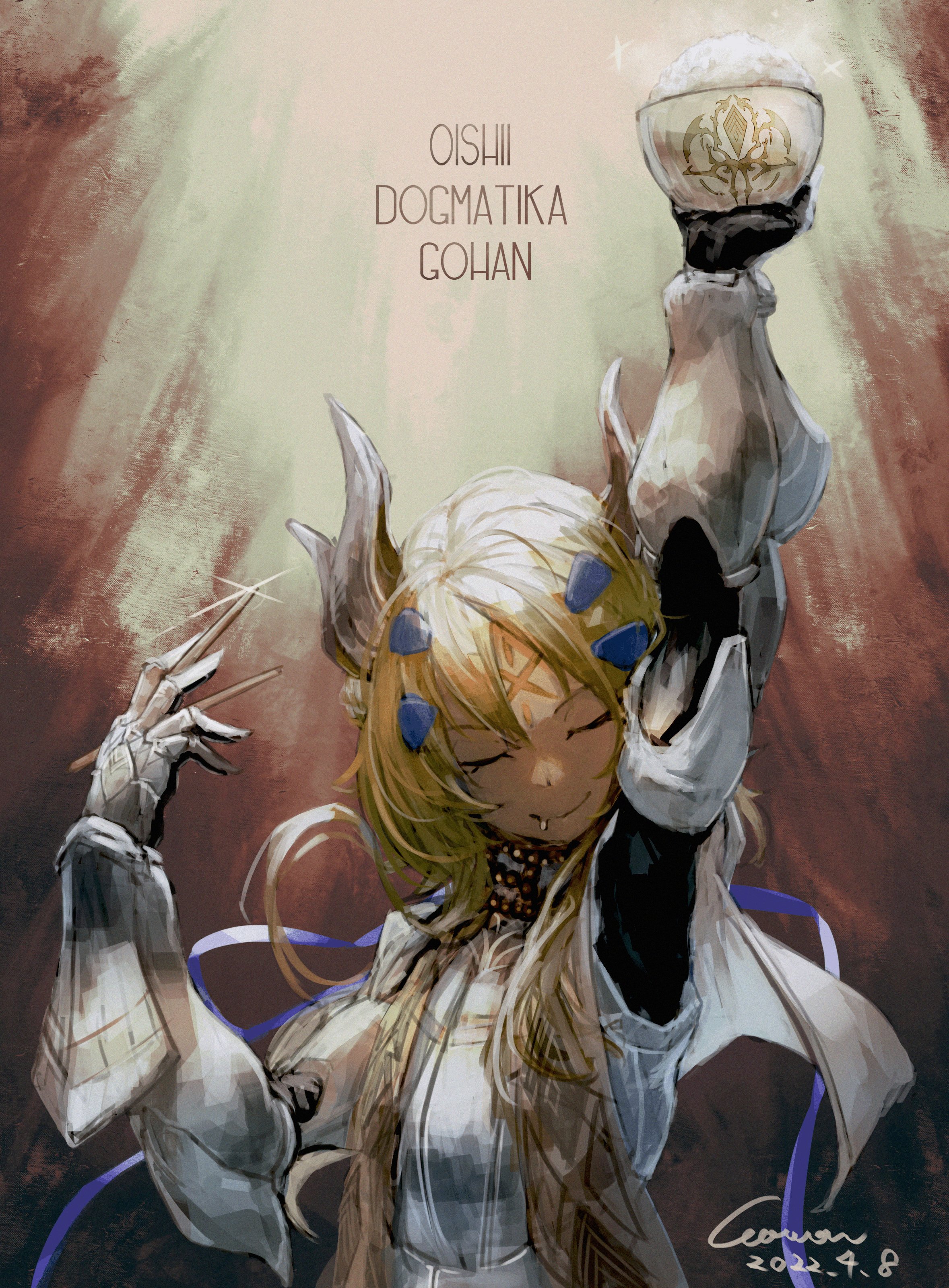 1girl absurdres armor armored_dress blonde_hair bowl breastplate chopsticks closed_eyes cowboy_shot dogmatika_ecclesia_the_virtuous dress duel_monster ecclesia_(yu-gi-oh!) facial_mark forehead_mark gauntlets hair_ornament headgear highres long_hair pauldrons rice rice_bowl shoulder_armor wawon_(wan_wawon) yu-gi-oh!