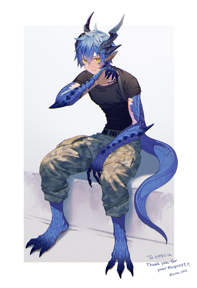 1boy animal_feet black_shirt blue_hair blue_scales camouflage camouflage_pants claws commission dragon_boy dragon_horns dragon_tail fingernails hand_up horns looking_at_viewer monster_boy original pants pants_rolled_up pointy_ears scales sharp_fingernails shirt short_hair sitting skeb_commission slit_pupils spikes tail yellow_eyes yuzu_shio