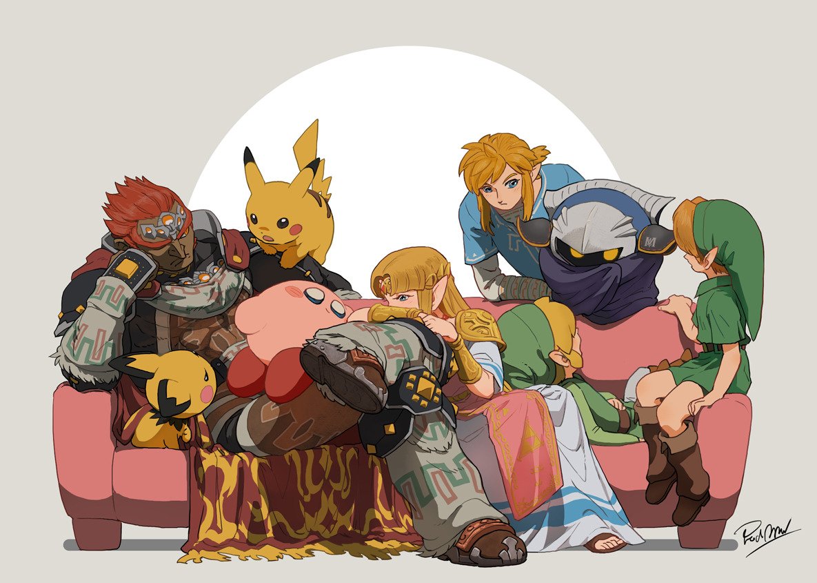 1girl 3others 4boys age_difference arm_on_knee armor artist_name assemblerones bandaged_arm bandages bare_legs belt belt_collar blonde_hair blue_eyes blush boots cape child collar collared_shirt couch crown dark-skinned_male dark_skin dress dress_shirt ganondorf gauntlets gen_1_pokemon gen_2_pokemon gerudo gloves glowing glowing_eyes hand_on_own_face hat kirby kirby_(series) leather_belt leg_armor link long_hair long_sideburns long_skirt long_sleeves looking_at_another lying mask mature_male meta_knight multiple_boys multiple_others muscular muscular_male nintendo no_pants on_back one_eye_closed pichu pikachu pointy_ears pointy_hat pointy_nose pokemon princess_zelda red_hair sandals shirt short_sleeves shoulder_armor shoulder_pads sideburns sitting skirt spiked_hair super_smash_bros. t-shirt the_legend_of_zelda the_legend_of_zelda:_a_link_between_worlds the_legend_of_zelda:_breath_of_the_wild the_legend_of_zelda:_ocarina_of_time thick_eyebrows tight_clothes toon_link tunic yellow_eyes young_link