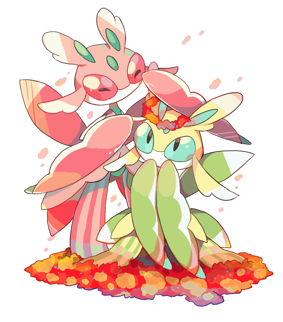 2girls ^_^ akadako alternate_color antennae arthropod_girl black_eyes blue_sclera closed_eyes colored_sclera colored_skin female_focus field flower flower_field flower_wreath full_body gen_7_pokemon green_skin hands_up happy highres looking_up lurantis multiple_girls nintendo no_mouth one-hour_drawing_challenge petals pink_skin pokemon pokemon_(creature) red_flower red_sclera shiny_pokemon simple_background sitting standing white_background white_skin yellow_flower yellow_skin