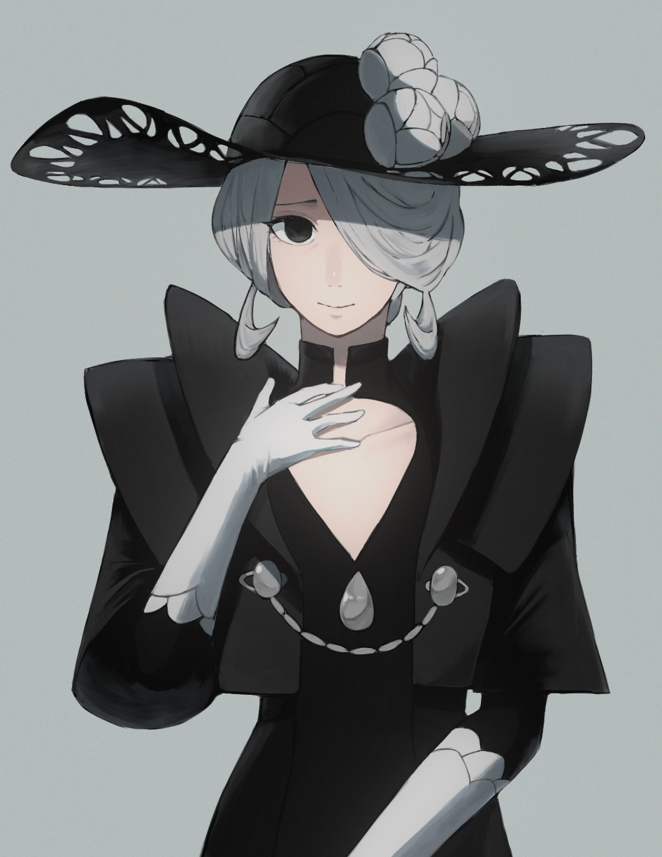 1girl bad_id bad_pixiv_id black_dress black_eyes black_hat closed_mouth cogita_(pokemon) collarbone dress female_focus flat_chest flower gloves grey_background grey_flower grey_hair hair_over_one_eye hand_on_own_chest hand_up happy hat hat_flower highres horezai layered_sleeves long_sleeves looking_at_viewer nintendo old old_woman one_eye_covered pokemon pokemon_legends:_arceus short_hair sidelocks simple_background smile solo standing straight_hair sun_hat upper_body white_gloves