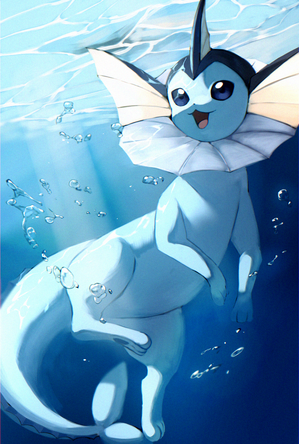 :3 animal_focus blue_background blue_eyes blue_theme bubble caustics commentary_request day full_body gen_1_pokemon happy highres horezai light_rays nintendo no_humans open_mouth pawpads pokemon pokemon_(creature) pokemon_focus smile solo swimming underwater vaporeon