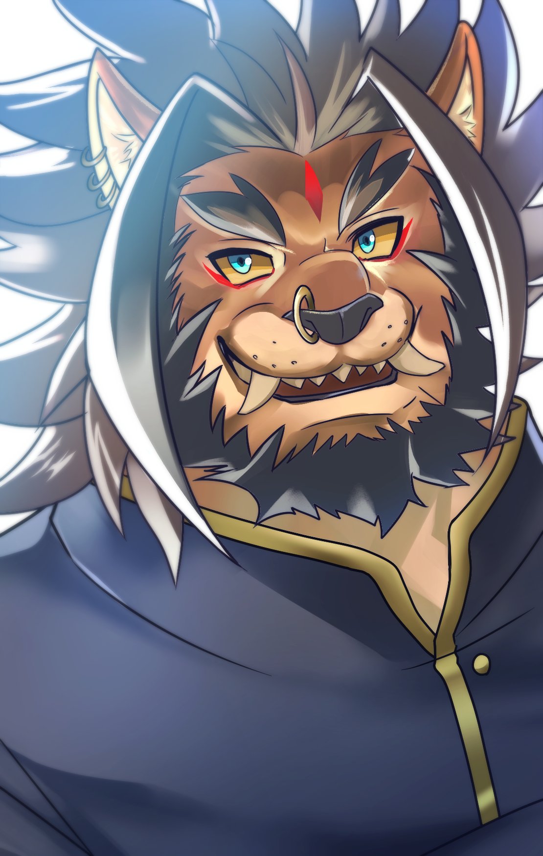 1boy animal_ears barong_(housamo) colored_sclera commentary_request ear_piercing face_piercing facial_mark fangs fangs_out forehead_mark furry furry_male gold_trim highres lion_boy lion_ears long_hair male_focus nose_piercing nose_ring piercing ramusyutarou ring_piercing smile snout solo spiked_hair tokyo_houkago_summoners upper_body white_background yellow_sclera