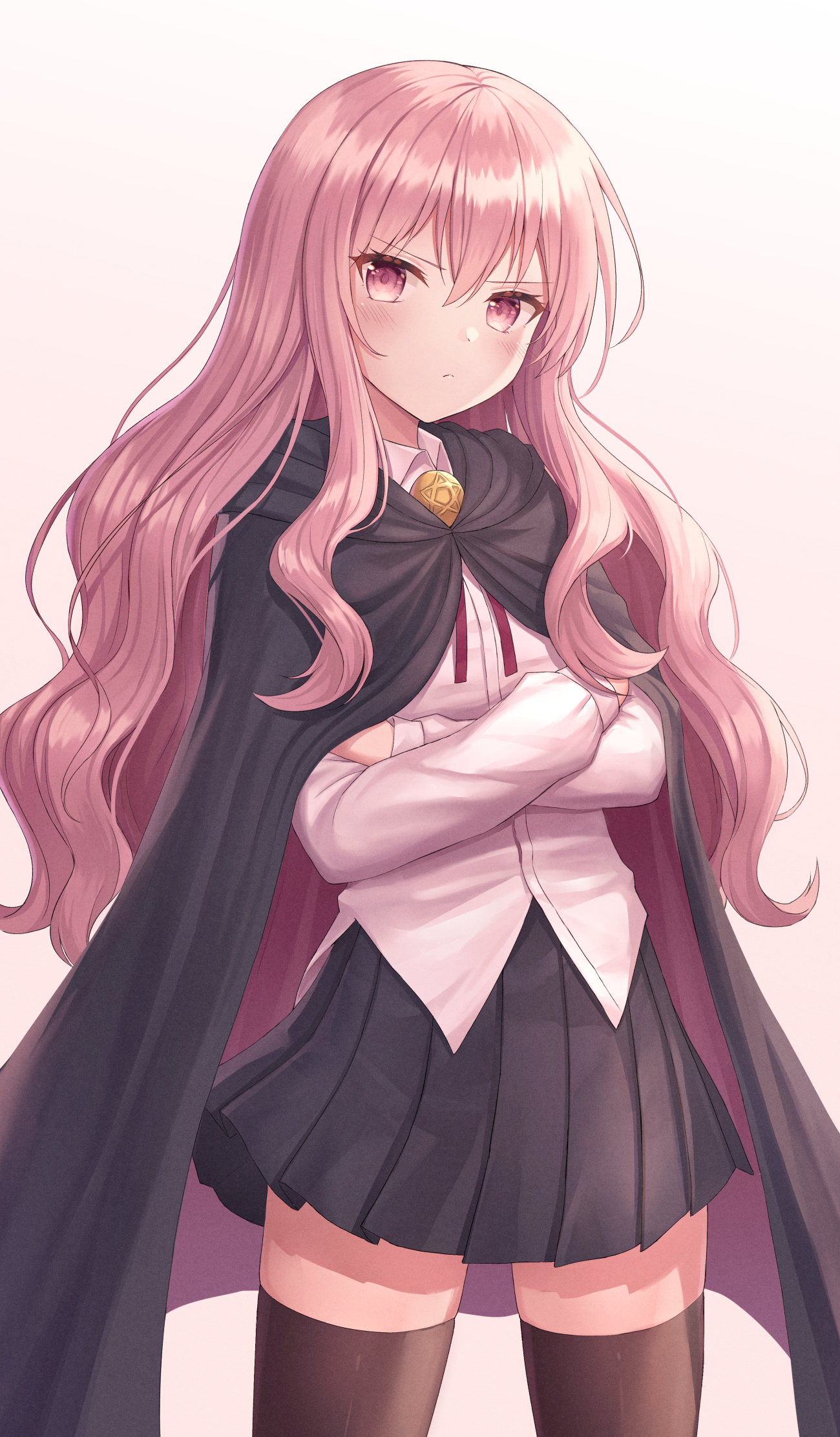 1girl black_cape black_skirt blush bolo_tie bright_pupils brown_thighhighs cape closed_mouth collared_shirt commentary crossed_arms frown hair_between_eyes highres long_hair long_sleeves looking_at_viewer louise_francoise_le_blanc_de_la_valliere necktie pink_eyes pink_hair pleated_skirt red_necktie seungju_lee shirt sidelocks simple_background skirt solo standing thighhighs v-shaped_eyebrows very_long_hair wavy_hair white_background white_shirt zero_no_tsukaima zettai_ryouiki