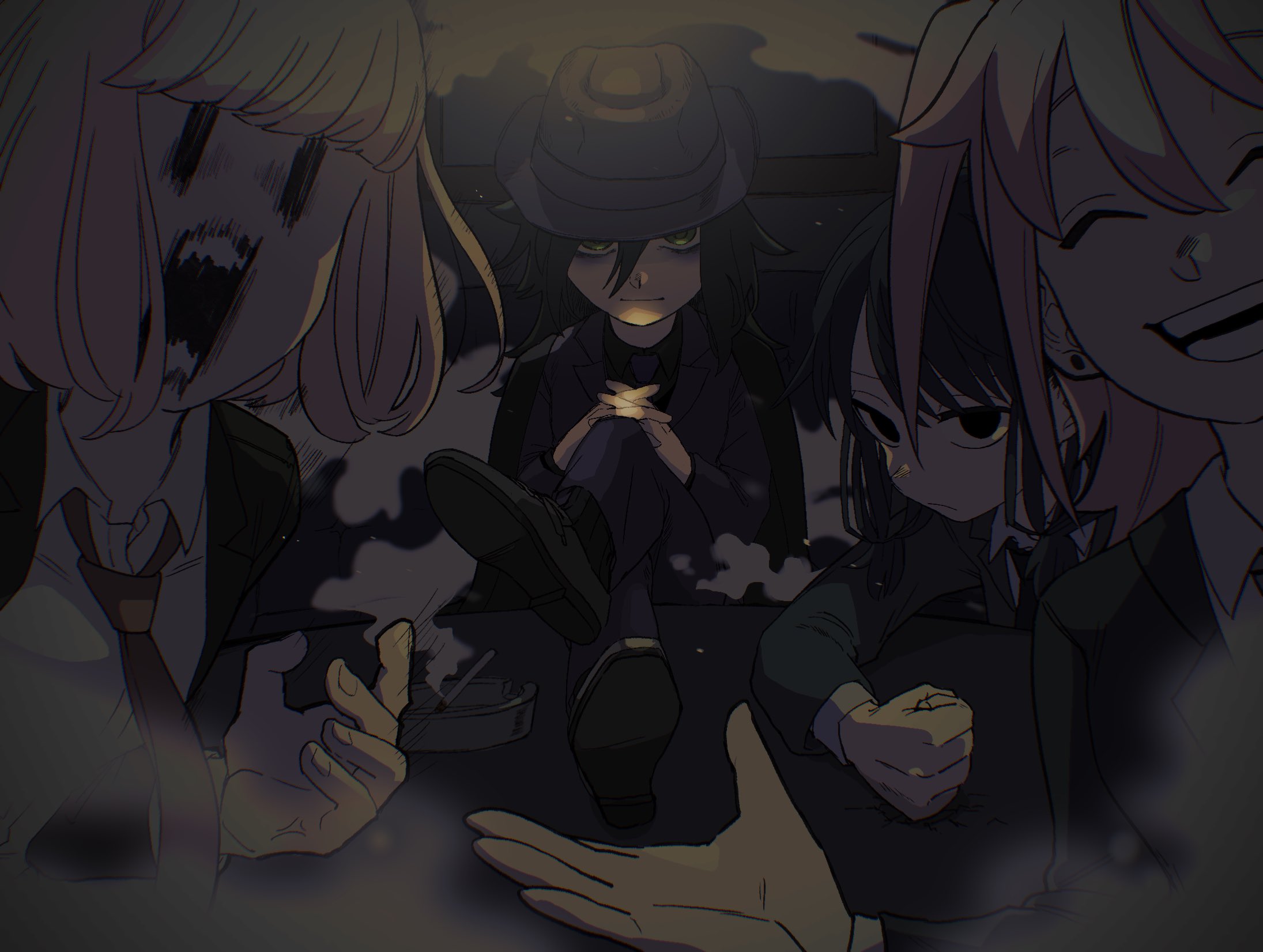 4girls ^_^ alternate_costume ashtray bags_under_eyes black_headwear black_jacket black_necktie black_shirt blazer blouse blue_eyes blunt_bangs cigarette clenched_hand closed_eyes collared_shirt commentary_request dress_shirt earrings expressionless fedora feet_on_table feet_up female_focus formal_clothes grin hair_between_eyes hat highres jacket jewelry kuroki_tomoko long_hair looking_at_viewer looking_up mafia multiple_girls necktie nemoto_hina open_mouth outstretched_arm pants pink_hair purple_jacket purple_necktie purple_pants red_necktie screaming shirt sitting smile smoke stud_earrings suit tamura_yuri teeth tsurukoge uchi_emiri unbuttoned unbuttoned_shirt watashi_ga_motenai_no_wa_dou_kangaetemo_omaera_ga_warui! white_shirt |_|