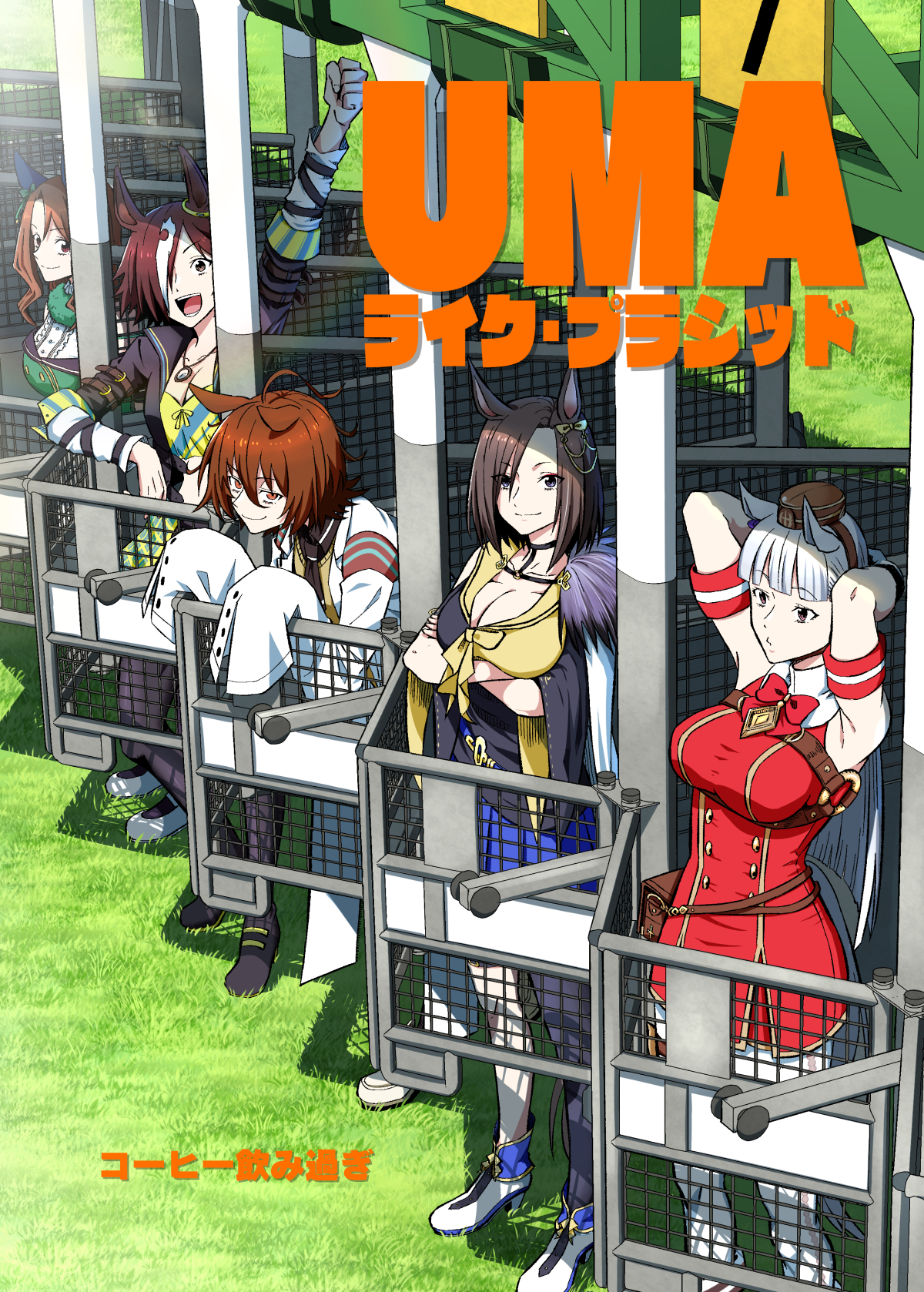 5girls agnes_tachyon_(tach-nology)_(umamusume) agnes_tachyon_(umamusume) ahoge air_groove_(umamusume) animal_ears arm_up armband arms_behind_head arms_under_breasts birii blunt_bangs bow bowtie breasts brown_eyes brown_hair clenched_hand cover cover_page crossed_arms dress ear_covers gold_ship_(umamusume) grass hair_over_one_eye harness highres horse_ears horse_girl horse_tail jacket jewelry king_halo_(umamusume) lab_coat large_breasts leaning_on_object long_hair long_sleeves medium_hair multicolored_hair multiple_girls necklace open_clothes open_jacket open_mouth outdoors pantyhose pillbox_hat red_bow red_bowtie shoes short_hair skirt smile tail two-tone_hair umamusume vodka_(umamusume) white_hair white_legwear