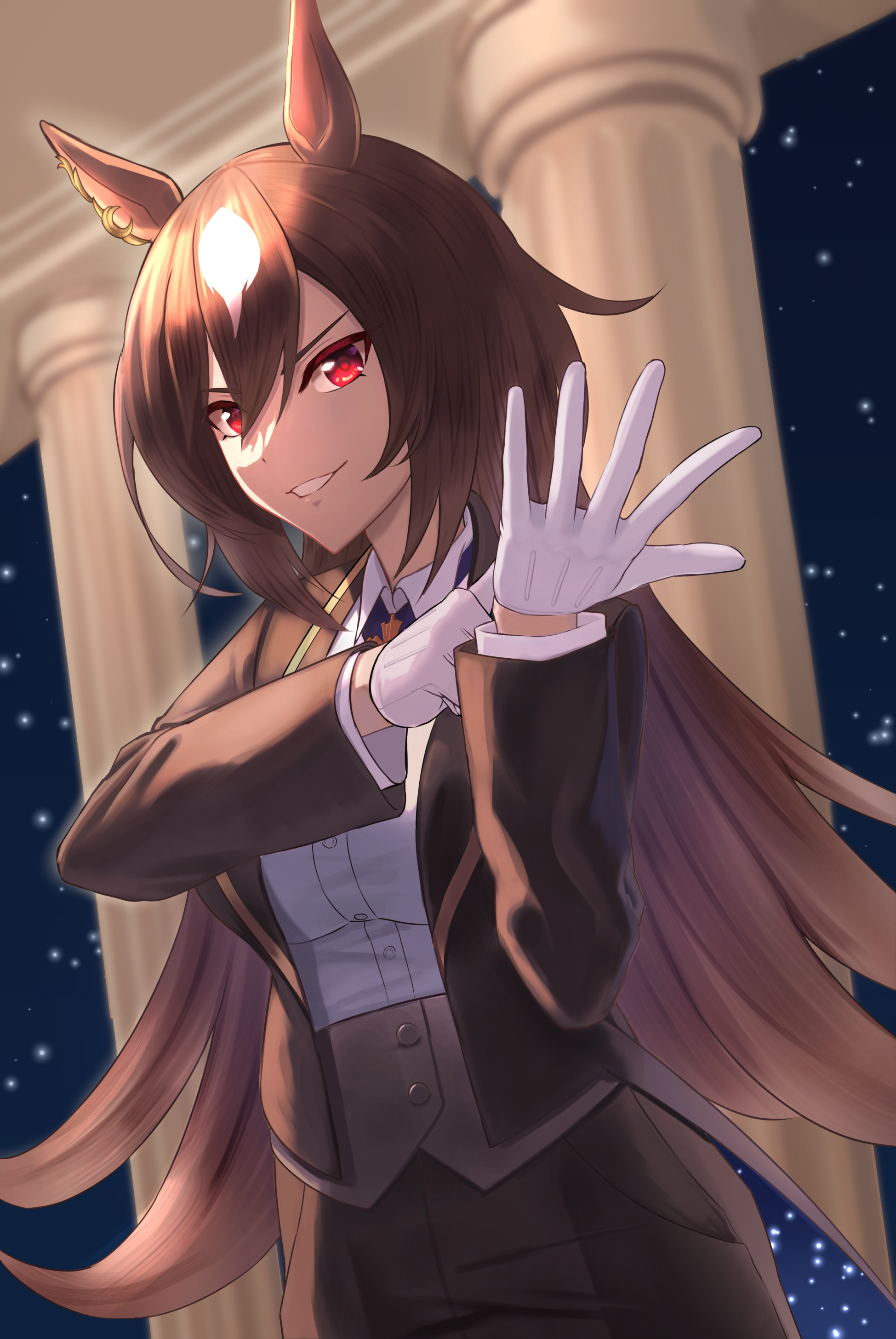 1girl absurdres animal_ears answering breasts brown_hair column commentary ear_covers formal_clothes gloves grin hand_up highres horse_ears horse_girl horse_tail jacket large_breasts long_hair night official_alternate_costume open_clothes open_jacket pant_suit pants pillar red_eyes shirt single_ear_cover sirius_symboli_(escorte_etoile)_(umamusume) sirius_symboli_(umamusume) sky smile solo star_(sky) starry_sky suit tail umamusume white_gloves white_shirt