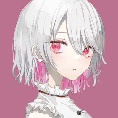 1girl blunt_bangs colored_inner_hair eyelashes hair_between_eyes indie_utaite looking_at_viewer lowres medium_hair multicolored_hair niconico open_mouth pink_background pink_eyes pink_hair portrait red_eyes hanamiya_rica shirt sumire_(nauth) utaite white_hair white_shirt