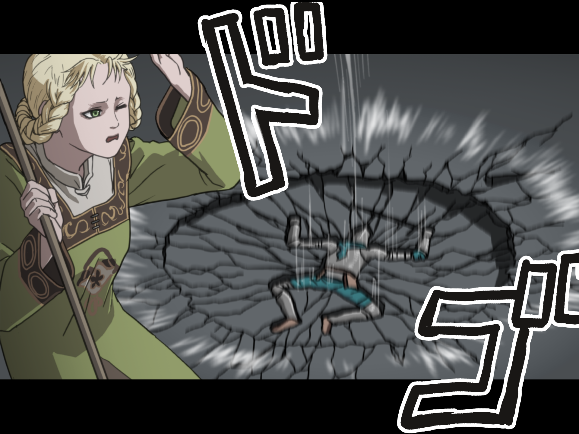 blonde_hair broom crater d: dress elden_ring green_dress green_eyes hair_rings hand_up highres holding holding_broom iota_tou letterboxed long_sleeves one_eye_closed open_mouth rya_(elden_ring) solo_focus tarnished_(elden_ring) through_ground