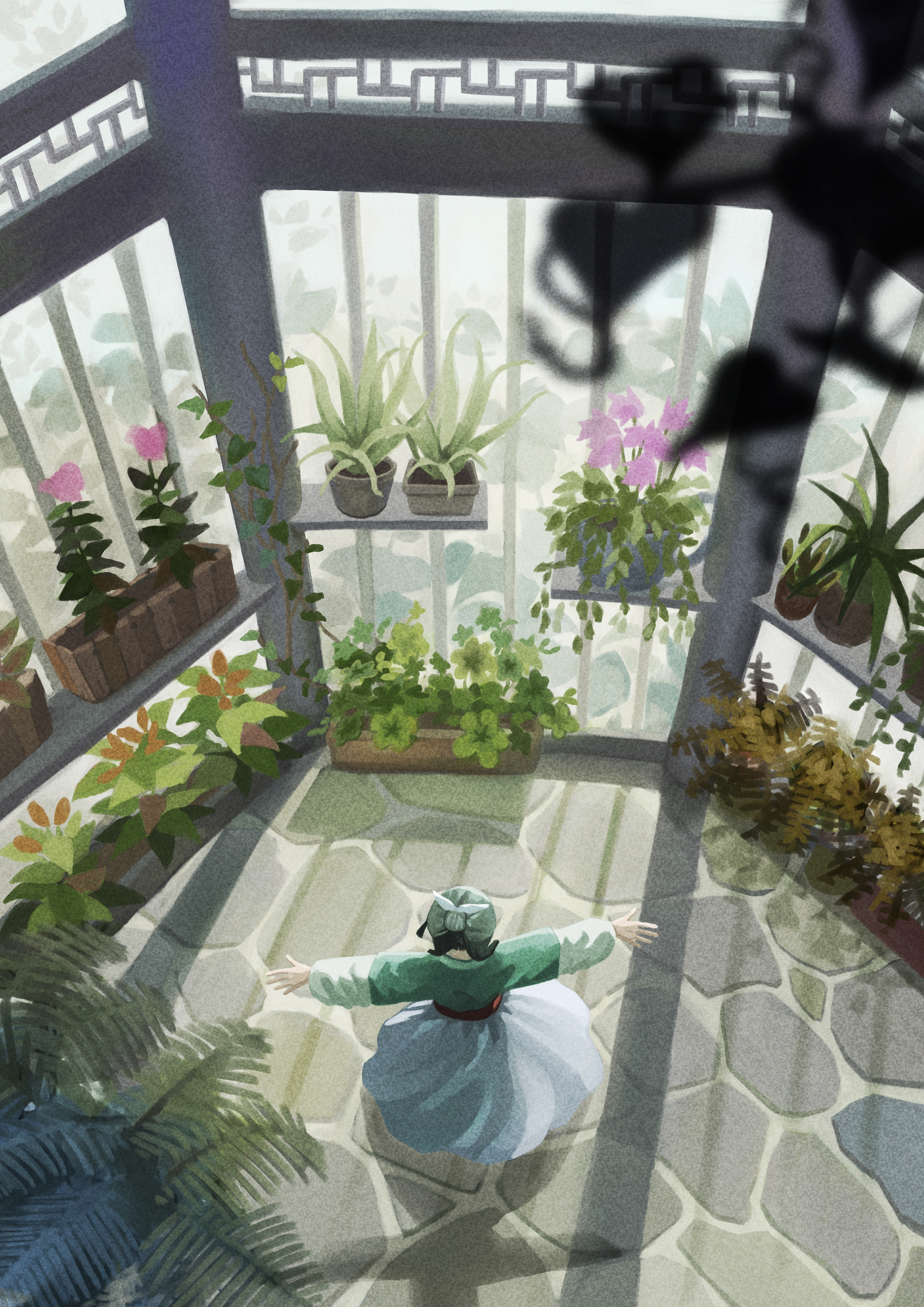 1girl absurdres bad_id bad_pixiv_id black_hair blue_skirt blurry bun_cover chinese_clothes dancing day depth_of_field facing_away flower from_above garden green_shirt hanfu hanging_plant highres indoors kusuriya_no_hitorigoto lattice long_sleeves maomao_(marble_creators) ohagi082014 outstretched_arms palm_leaf pavement plant potted_plant sash shadow shirt skirt solo spread_arms