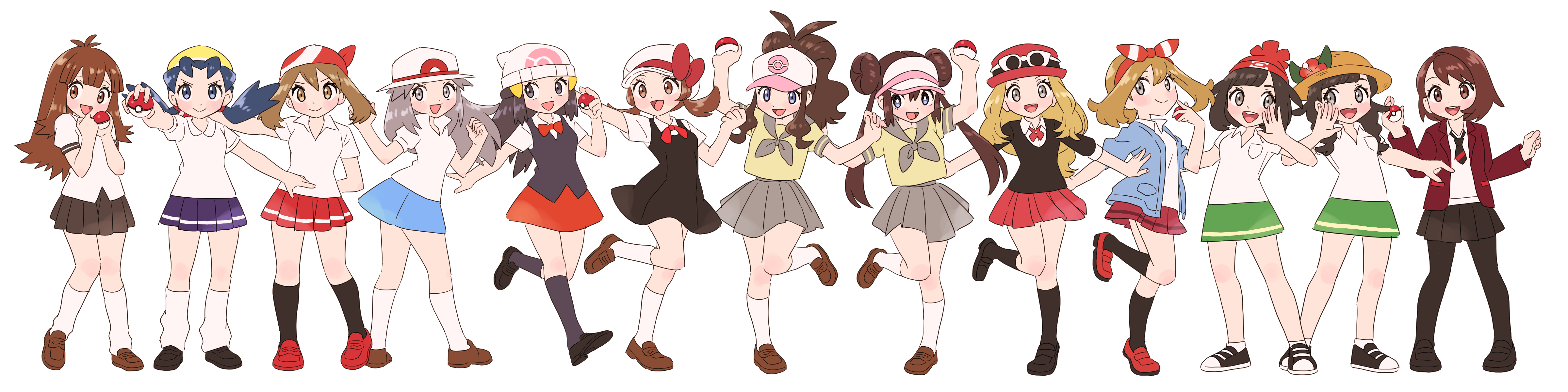 6+girls absurdres alternate_costume antenna_hair arm_behind_back arm_up bandana baseball_cap beanie black_dress black_eyes black_hair black_necktie black_shirt black_shoes black_skirt black_socks black_vest blonde_hair blue_eyes blue_hair blue_jacket blue_skirt blush blush_stickers bow bowtie braid breast_pocket breasts bright_pupils brown_eyes brown_hair brown_hat brown_shoes clenched_hand clone closed_mouth collared_shirt cosplay dawn_(pokemon) derivative_work double_bun dress everyone eye_contact eyewear_on_head flat_chest flat_color flower full_body gloria_(pokemon) green_(pokemon) green_skirt grey_eyes grey_hair grey_neckerchief grey_sailor_collar grey_skirt hair_bun hair_tie hairband hand_up hands_up happy hat hat_bow hat_flower heel_up highres hilda_(pokemon) holding holding_poke_ball jacket kneehighs knees_together_feet_apart kris_(pokemon) lass_(pokemon) lass_(pokemon)_(cosplay) lass_(pokemon_bw) lass_(pokemon_dppt) lass_(pokemon_frlg) lass_(pokemon_gsc) lass_(pokemon_hgss) lass_(pokemon_oras) lass_(pokemon_rgby) lass_(pokemon_rse) lass_(pokemon_sm) lass_(pokemon_swsh) lass_(pokemon_xy) leaf_(pokemon) leg_up long_hair long_image long_sleeves looking_at_another looking_at_viewer looking_to_the_side lyra_(pokemon) matching_hair/eyes may_(pokemon) medium_hair miniskirt multiple_girls neckerchief necktie newsboy_cap nintendo open_clothes open_jacket open_mouth outstretched_arm outstretched_arms own_hands_together pantyhose pinafore_dress pink_headwear pleated_skirt pocket poke_ball poke_ball_(basic) poke_ball_symbol poke_ball_theme pokemon pokemon_black_and_white pokemon_black_2_and_white_2 pokemon_diamond/pearl/platinum pokemon_firered_and_leafgreen pokemon_gold/silver/crystal pokemon_heartgold_and_soulsilver pokemon_lgpe pokemon_omega_ruby_and_alpha_sapphire pokemon_ruby/sapphire/emerald pokemon_sun_and_moon pokemon_sword_and_shield pokemon_ultra_sun_and_ultra_moon pokemon_x_and_y ponytail pumpkinpan red_bandana red_bow red_bowtie red_flower red_hairband red_hat red_jacket red_shoes red_skirt rosa_(pokemon) sailor_collar school_uniform selene_(pokemon) serafuku serena_(pokemon) shirt shoes short_hair short_necktie short_sleeves sidelocks simple_background skirt sleeveless sleeveless_dress small_breasts smile socks split_mouth standing standing_on_one_leg straw_hat sunglasses swim_cap teeth traditional_bowtie twin_braids twintails v-shaped_eyebrows vest visor_cap white-framed_eyewear white_background white_hat white_pupils white_shirt white_socks wide_image yellow_hat yellow_shirt
