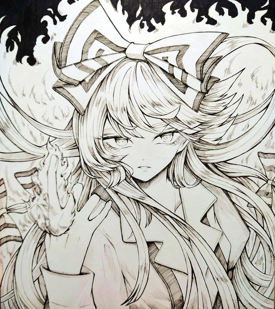 1girl bow collarbone collared_shirt fire fire floating_hair fujiwara_no_mokou hair_bow hand_up hatching_(texture) linear_hatching lips long_hair long_sleeves looking_at_viewer mamiru_(42105269) monochrome shirt sidelocks solo suspenders touhou traditional_media tsurime upper_body very_long_hair white_hair white_shirt
