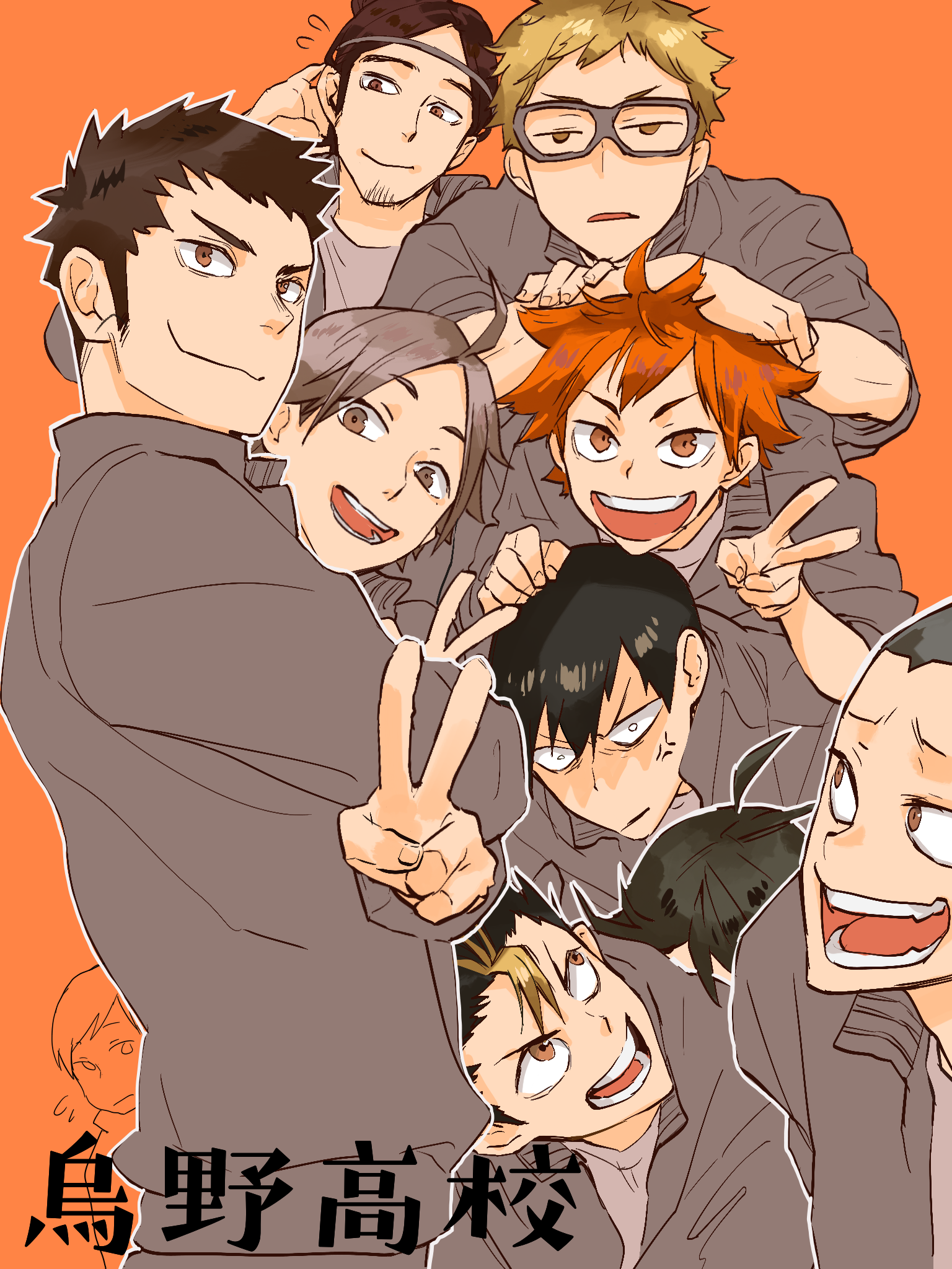 6+boys 830_(hamio) ahoge anger_vein azumane_asahi black_hair blonde_hair brown_eyes crossed_arms colored_bangs facial_hair glasses grey_hair grey_jacket haikyuu!! highres hinata_shouyou jacket kageyama_tobio looking_at_viewer messy_hair multiple_boys nishinoya_yuu open_mouth orange_background outline sawamura_daichi shaved_head smile stubble sugawara_koushi tanaka_ryuunosuke tsukishima_kei v white_outline yamaguchi_tadashi