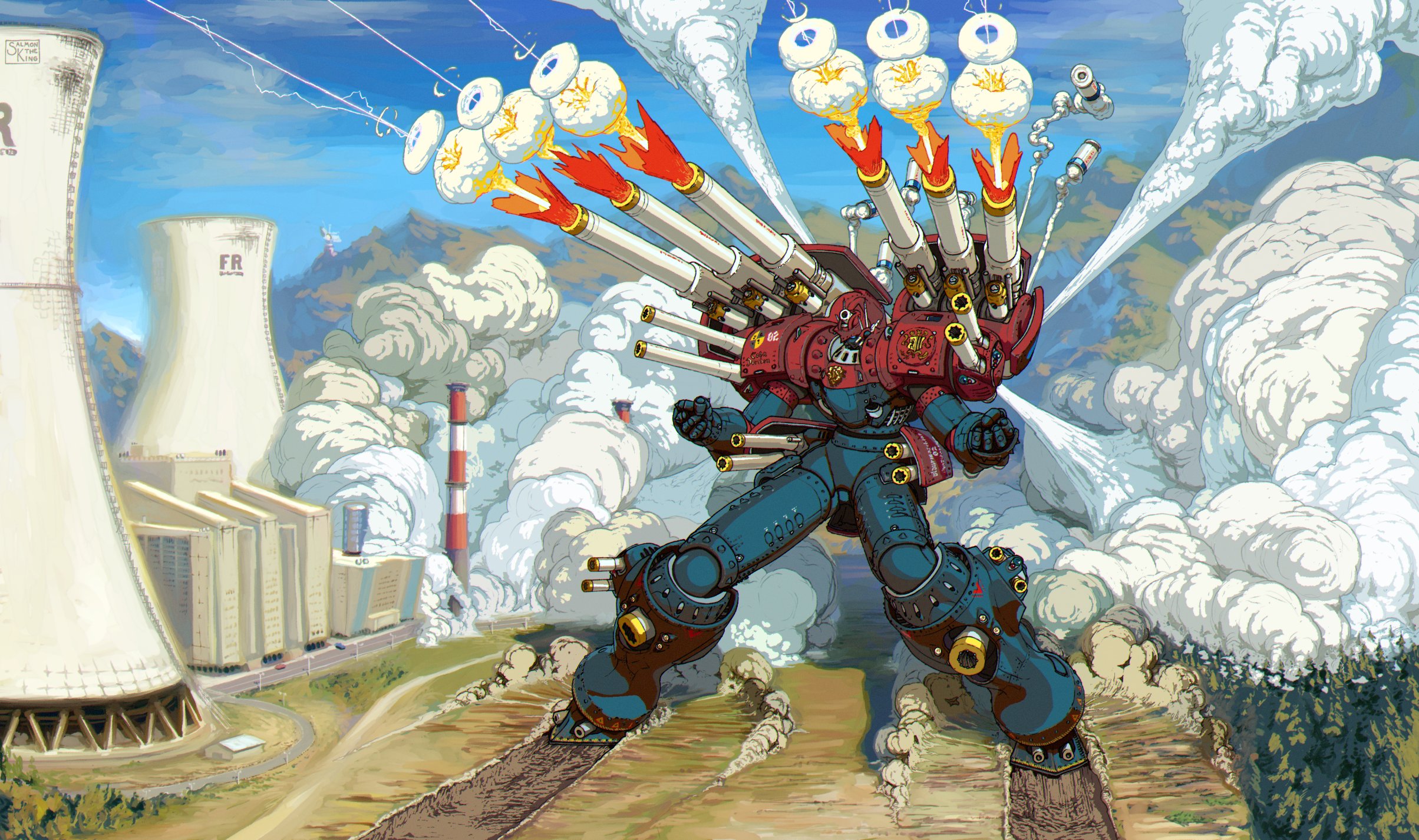 blue_eyes clenched_hands commentary english_commentary firing highres king_salmon mecha mountain no_humans original robot science_fiction shoulder_cannon sky smoke smokestack solo