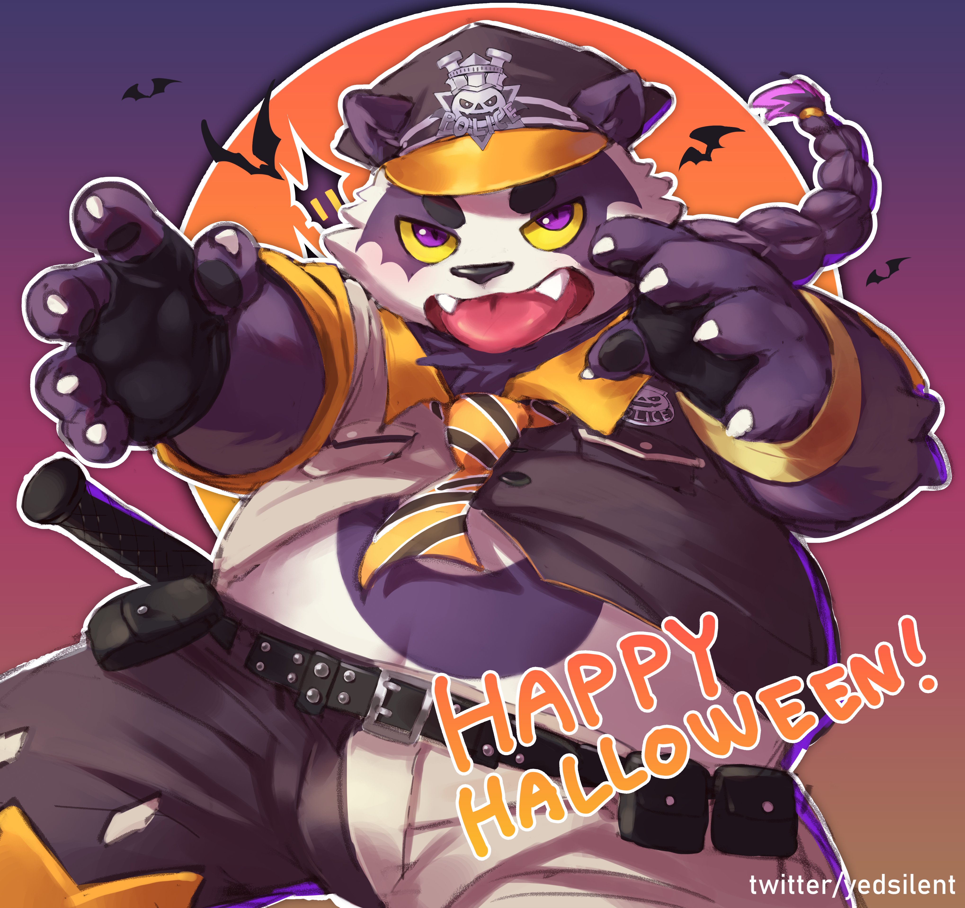 1boy absurdres alp_(housamo) animal_ears animal_nose bat_(animal) belly belt black_necktie braid claws colored_sclera colored_tips fangs fangs_out fingernails furry furry_male gradient_background happy_halloween hat highres long_hair looking_at_viewer male_focus moon multicolored_hair multicolored_necktie necktie orange_background orange_moon orange_necktie panda_boy panda_ears plump police police_hat police_uniform purple_background purple_eyes purple_fur purple_hair sharp_fingernails shirt simple_background solo studded_belt tokyo_houkago_summoners tongue tongue_out twitter_username two-tone_fur upper_body white_fur yedsilent yellow_sclera