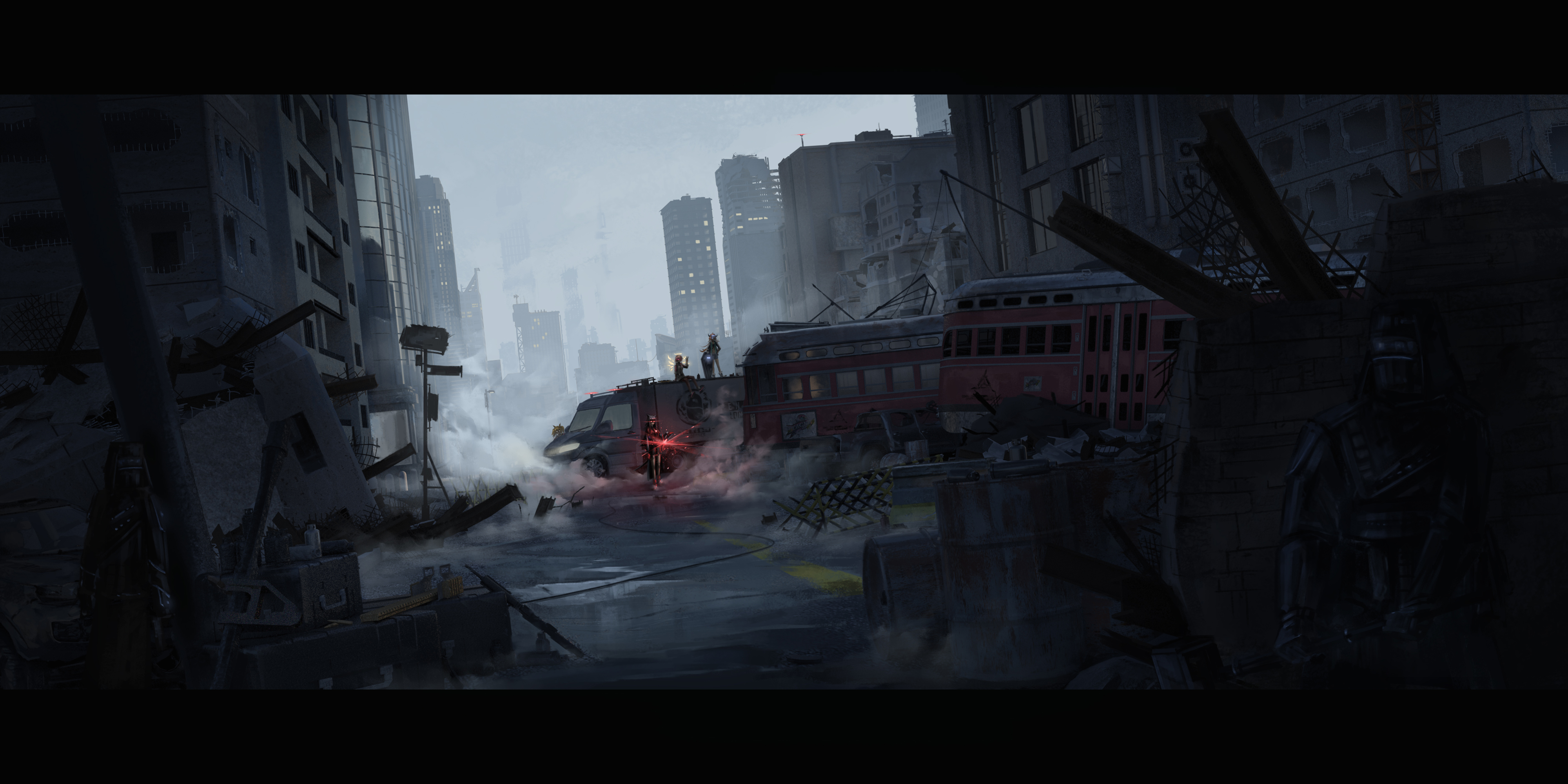 2others 4girls absurdres arknights az841629 box_truck building chinese_commentary city cityscape cloud cloudy_sky commentary_request croissant_(arknights) exusiai_(arknights) glowing glowing_eyes hiding highres letterboxed motor_vehicle multiple_girls multiple_others on_vehicle outdoors penguin_logistics_(arknights) penguin_logistics_logo pickup_truck ruins scenery semi_truck sky skyscraper sora_(arknights) texas_(arknights) traffic_light trailer train truck window wreckage