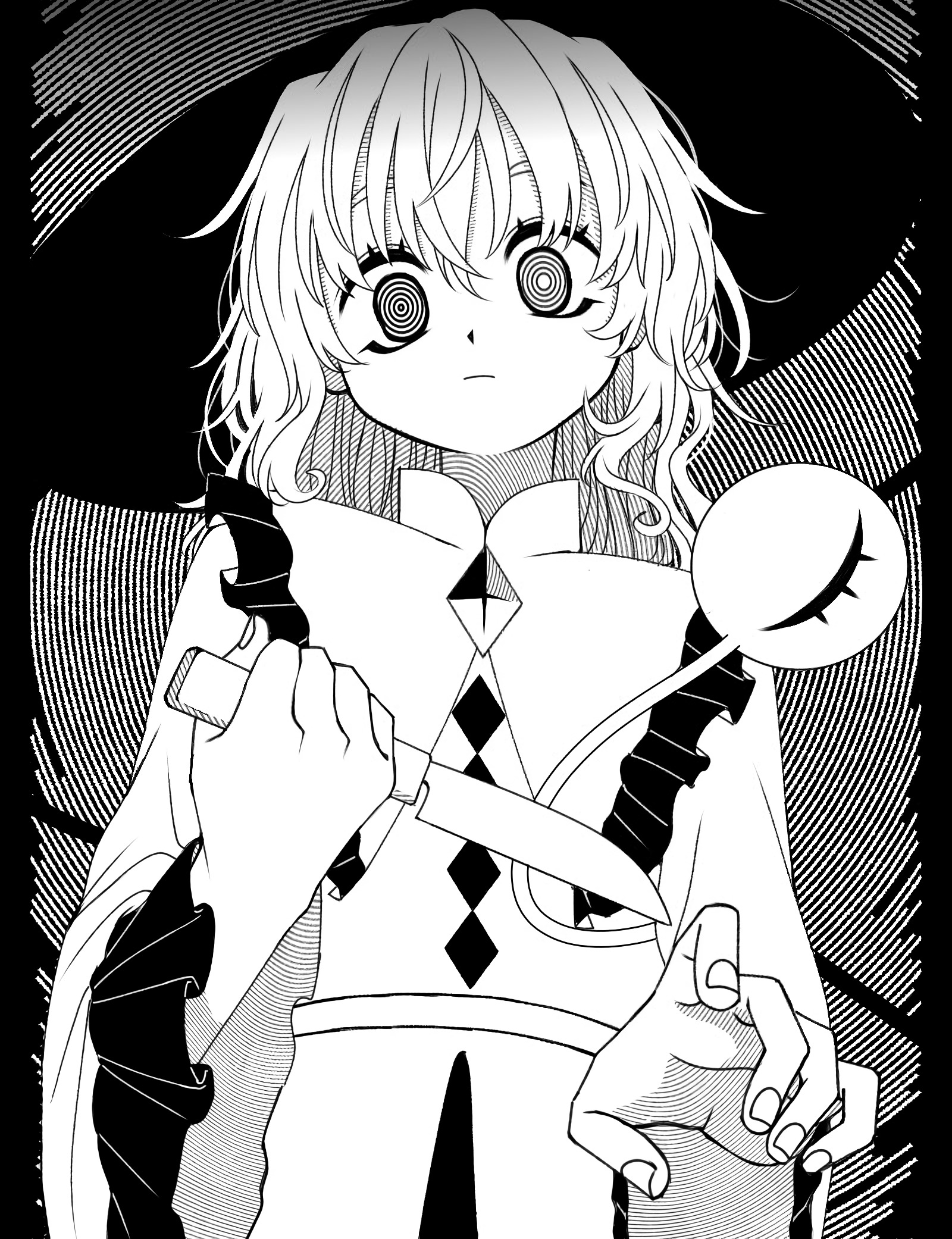 1girl @_@ bad_id bad_pixiv_id blouse buttons closed_mouth commentary diamond_button eyebrows_hidden_by_hair fingernails frilled_shirt_collar frilled_sleeves frills greyscale hair_between_eyes hat highres holding holding_knife knife komeiji_koishi light_frown long_hair long_sleeves looking_at_viewer mismatched_pupils monochrome reaching reaching_towards_viewer safe3133 shirt solo third_eye touhou upper_body wide_sleeves