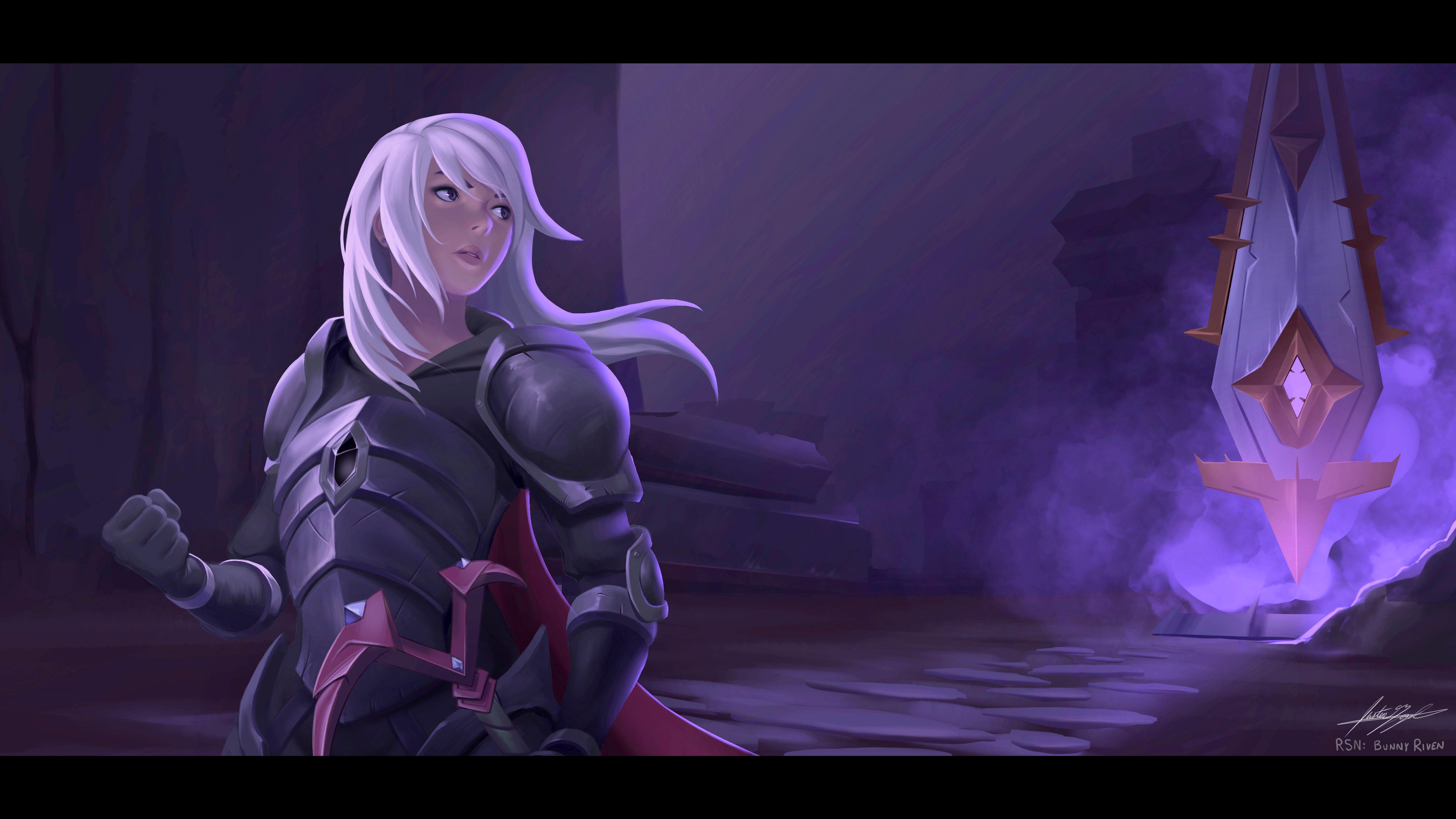 1girl absurdres armor cape clenched_hand commentary cowboy_shot crack english_commentary fantasy floating_hair furrowed_brow gem gloves grey_eyes hand_up highres holding justin_gozal letterboxed long_hair looking_at_object looking_away medieval orikalkum_mattock parted_lips pink_lips plate_armor purple_theme pylon red_cape runescape shiny_clothes sideways_glance signature smoke solo standing tareme underground username_tag white_hair