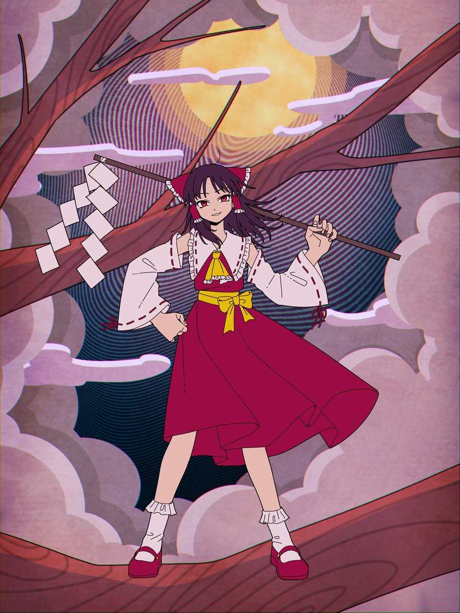 1girl bad_id bad_pixiv_id bow branch brown_hair cloud commentary detached_sleeves dress eyebrows_hidden_by_hair frilled_bow frilled_hair_tubes frilled_socks frills full_body full_moon gohei hair_bow hair_tubes hakurei_reimu highres holding long_sleeves looking_at_viewer mary_janes medium_hair moon parted_lips red_bow red_dress red_eyes red_shoes ribbon-trimmed_sleeves ribbon_trim safe3133 shoes sidelocks sleeveless sleeveless_dress smile socks solo untranslatable_commentary touhou tsurime waist_bow white_sleeves white_socks wide_sleeves yellow_bow