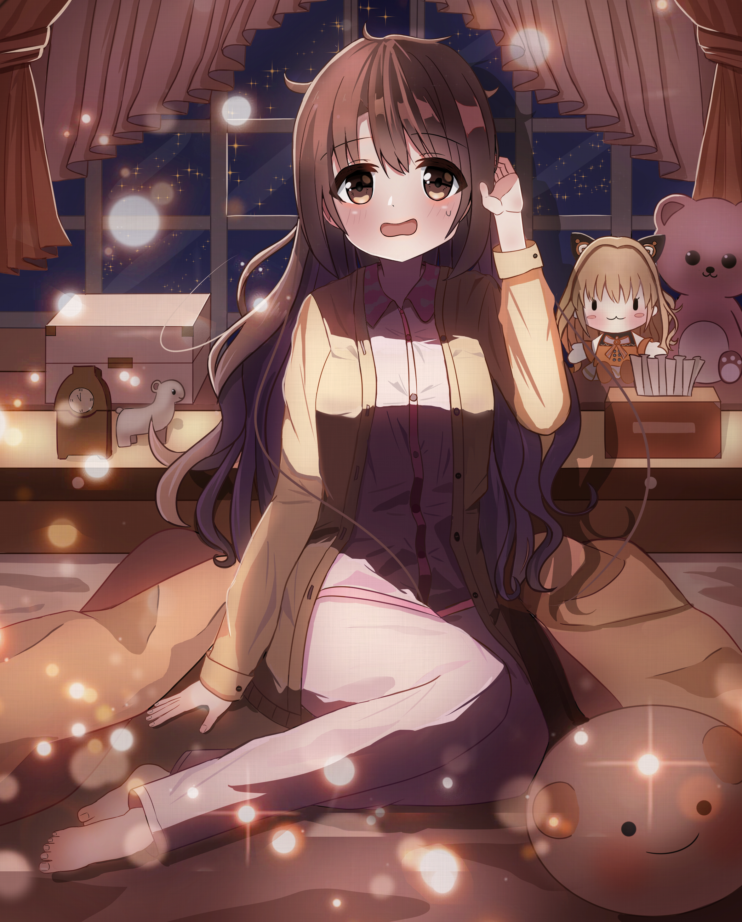 1girl :o absurdres bed_sheet blanket blurry blush bokeh brown_hair cardigan character_doll cushion dayoon_(htrc7254) depth_of_field doll highres idolmaster idolmaster_cinderella_girls indoors long_hair messy_hair night pajamas pink_pajamas seeu shimamura_uzuki sitting sky solo star_(sky) stuffed_toy sweat very_long_hair vocaloid yellow_cardigan yokozuwari
