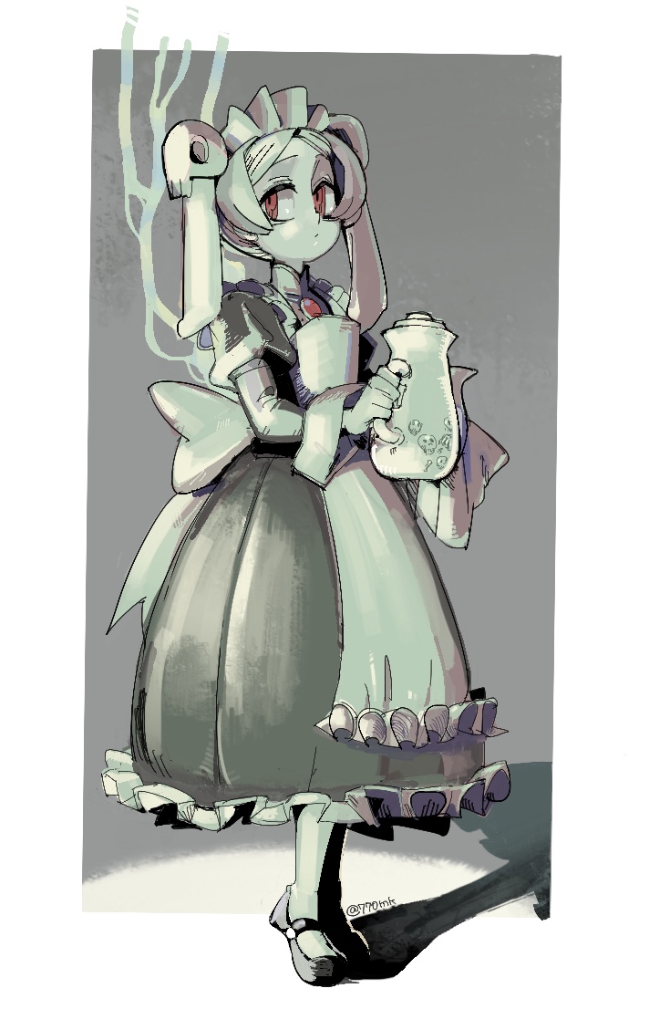 1girl 770mk apron bloody_marie_(skullgirls) brooch dress frilled_apron frilled_dress frills full_body grey_background grey_hair hair_ornament jewelry maid_headdress mary_janes red_eyes shoes skull_hair_ornament skullgirls solo standing teapot twintails