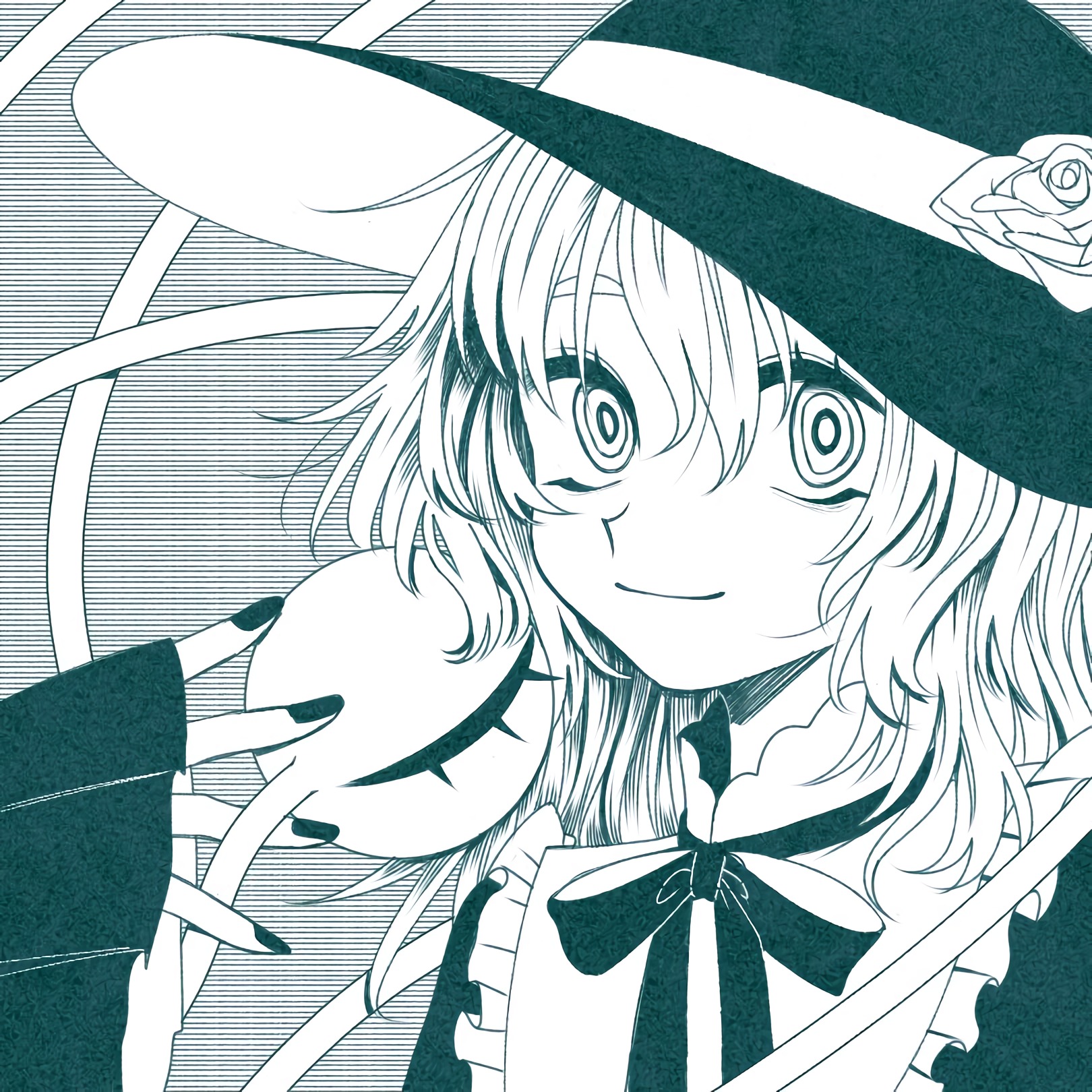 1girl bad_id bad_pixiv_id blouse bow bowtie closed_mouth eyebrows_hidden_by_hair fingernails flower frilled_shirt_collar frills greyscale hand_up hat hat_flower highres komeiji_koishi long_hair looking_at_viewer monochrome portrait rose safe3133 shirt smile solo untranslatable_commentary third_eye touhou wide_sleeves