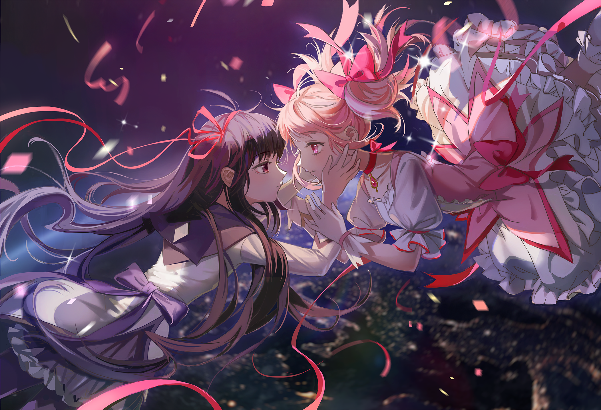 2girls akemi_homura akemi_homura_(magical_girl) choker dress earth_(planet) eye_contact frilled_dress frilled_sleeves frills gloves hair_ribbon haitu hand_on_another's_arm hands_on_another's_face hands_up highres kaname_madoka kaname_madoka_(magical_girl) looking_at_another magical_girl mahou_shoujo_madoka_magica multiple_girls parted_lips pink_ribbon planet purple_ribbon red_choker red_ribbon ribbon ribbon_choker space white_gloves yuri