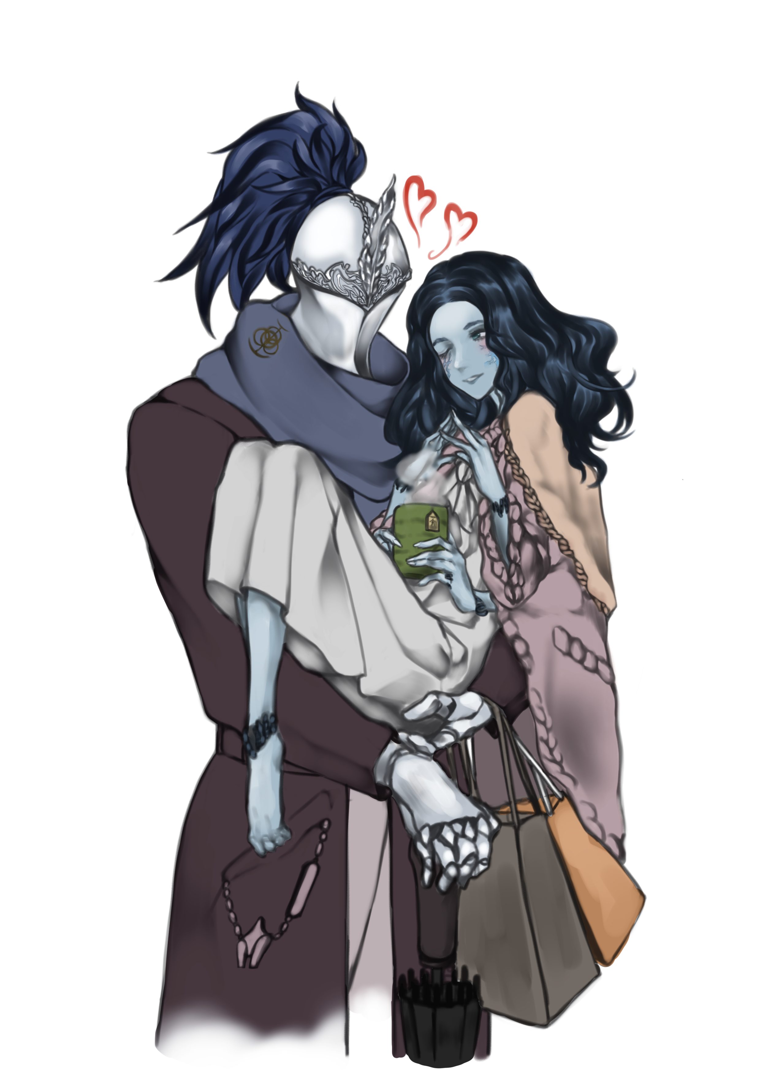 1girl 1other absurdres alternate_costume ambiguous_gender bag black_hair blue_scarf blue_skin blush brown_jacket carrying carrying_person colored_skin commentary_request contemporary cup doll_joints dress elden_ring extra_arms gauntlets grin heart helmet highres holding holding_bag holding_cup holding_umbrella illip jacket joints knight long_hair long_sleeves looking_at_another mixed-language_commentary own_hands_together paper_bag pocket princess_carry ranni_the_witch scarf shawl simple_background smile tarnished_(elden_ring) umbrella white_background white_dress