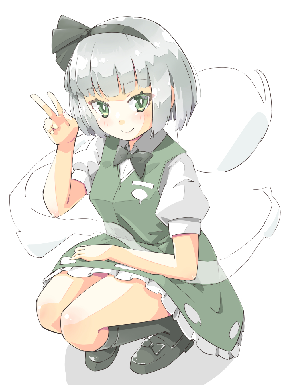 1girl arnest black_hairband black_shoes black_socks blouse blunt_bangs blush bob_cut bright_pupils collared_shirt dress frilled_dress frills full_body green_dress green_eyes grey_hair hair_ribbon hairband hand_on_lap hand_up highres hitodama_print kneehighs konpaku_youmu konpaku_youmu_(ghost) loafers looking_at_viewer puffy_short_sleeves puffy_sleeves ribbon shirt shoes short_hair short_sleeves sidelocks simple_background smile socks solo squatting touhou tsurime v white_background white_pupils white_shirt wing_collar youmu_day