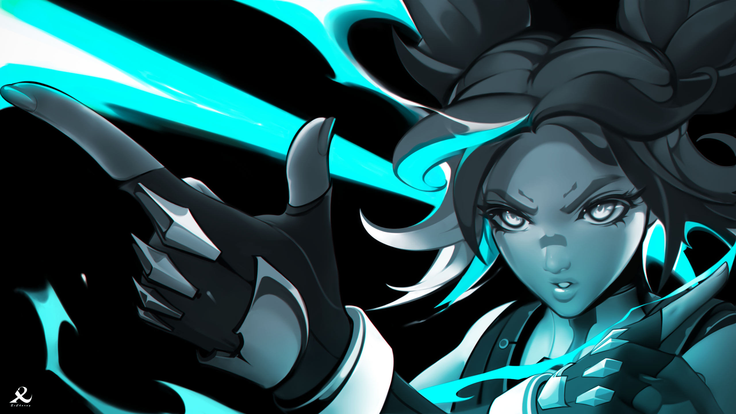 1girl animification commentary electricity english_commentary excharny finger_gun fingerless_gloves floating_hair gloves highres looking_ahead neon_(valorant) parted_bangs parted_lips portrait solo spot_color two_side_up v-shaped_eyebrows valorant
