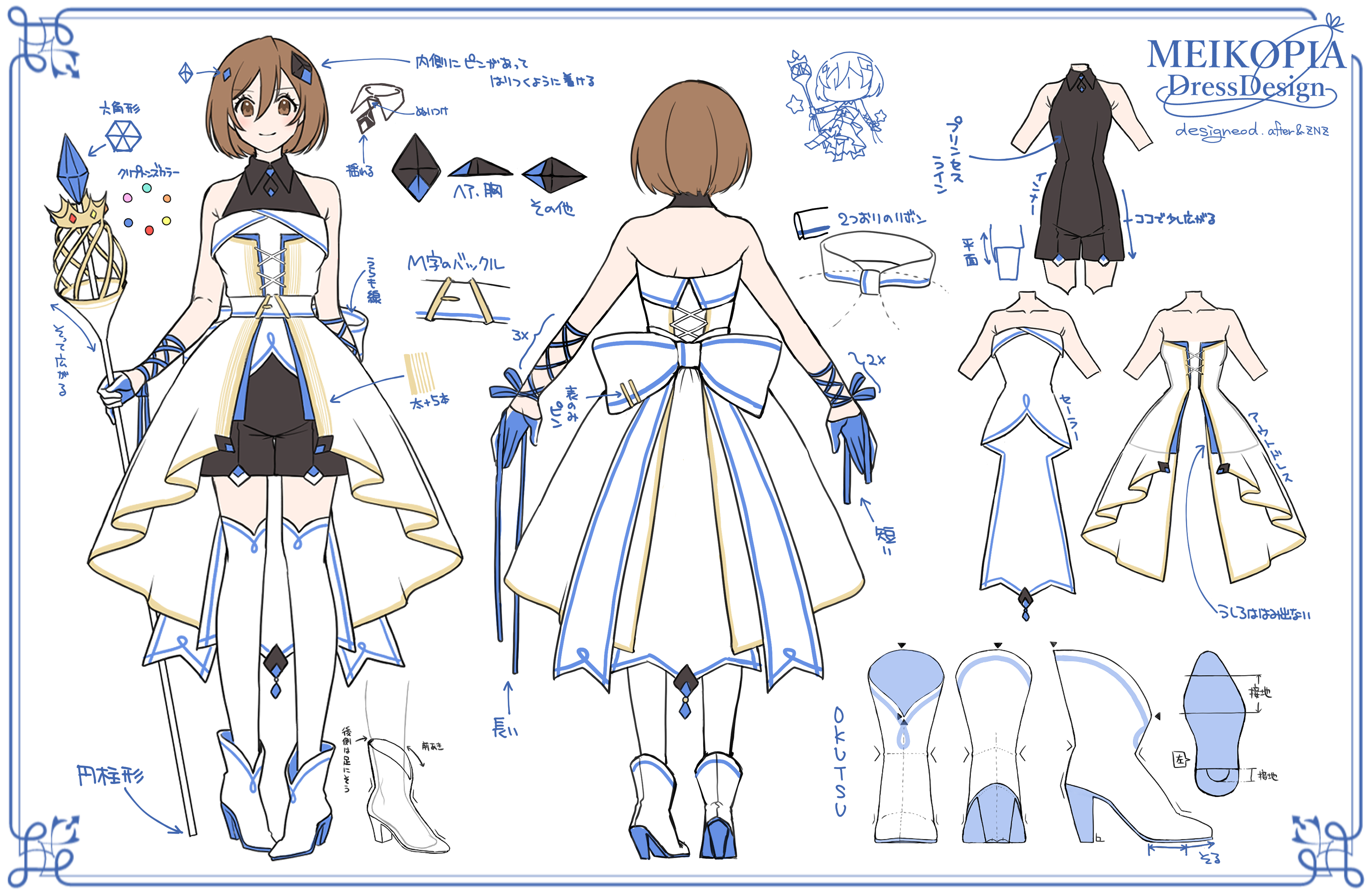 1girl absurdres after0217 bow brown_eyes brown_hair reference_sheet concept_art gloves hair_ornament highres meiko_(vocaloid) meikopia multiple_views ribbon scepter short_hair sleeveless smile standing thighhighs translation_request vocaloid