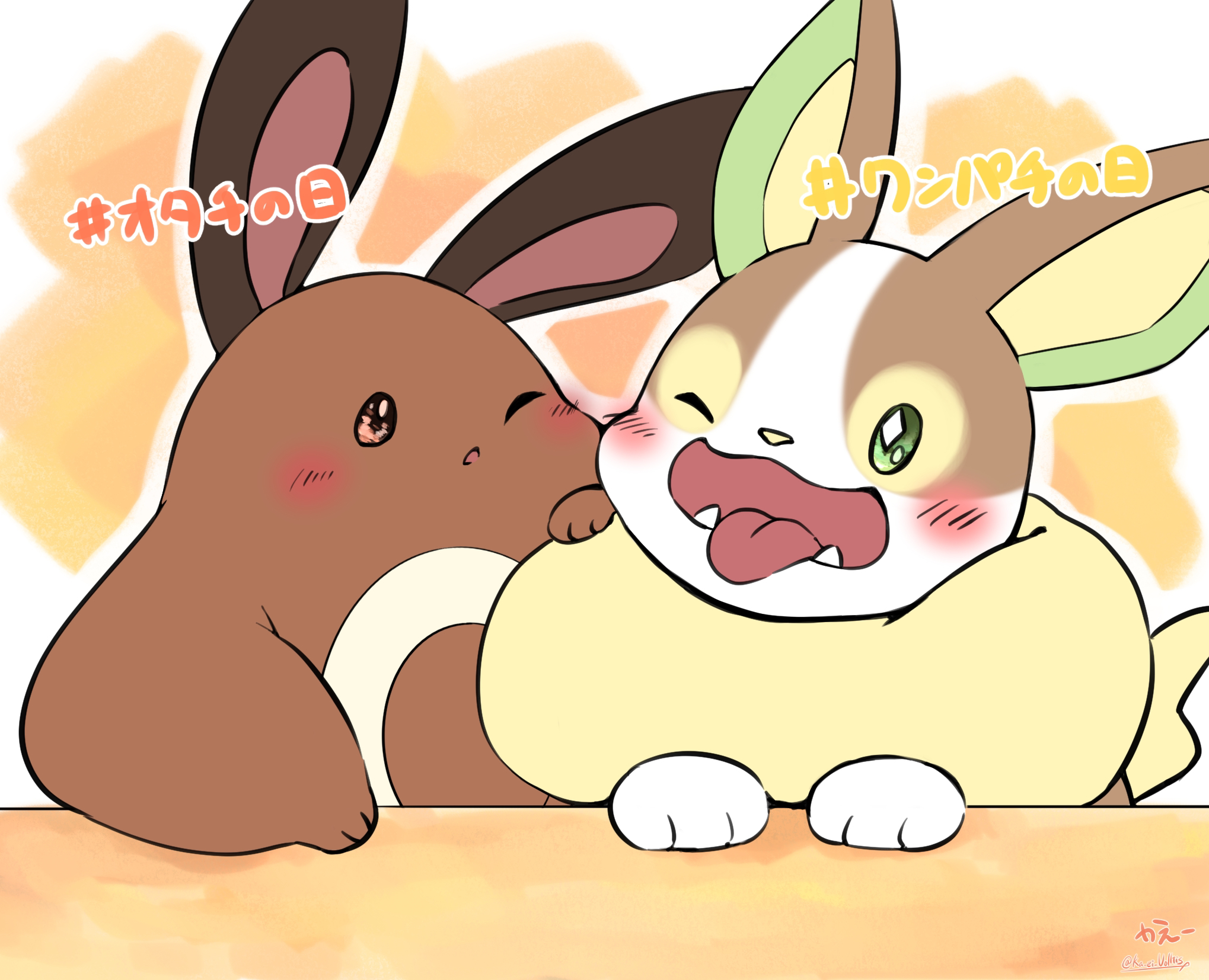 animal_focus artist_name blush bright_pupils brown_eyes character_name cheek-to-cheek diamond-shaped_pupils diamond_(shape) eye_contact fangs flat_color gen_2_pokemon gen_8_pokemon green_eyes happy heads_together highres japanese_text ka_ei_volltis looking_at_another looking_to_the_side nintendo no_humans one_eye_closed open_mouth orange_background outline pokemon pokemon_(creature) sentret signature simple_background sketch smile symbol-shaped_pupils tongue tongue_out translated twitter_username upper_body white_outline white_pupils yamper